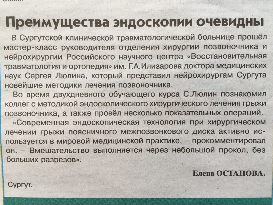 В Сургутской клинической травматологической больнице прошел мастер-класс руководителя отделения хирургии позвоночника и нейрохирургии Российского научного центра «Восстановительная травматология и ортопедия» им. академика Г.А. Илизарова Сергея Люлина, который представил нейрохирургам Сургута новейшие методики лечения позвоночника.