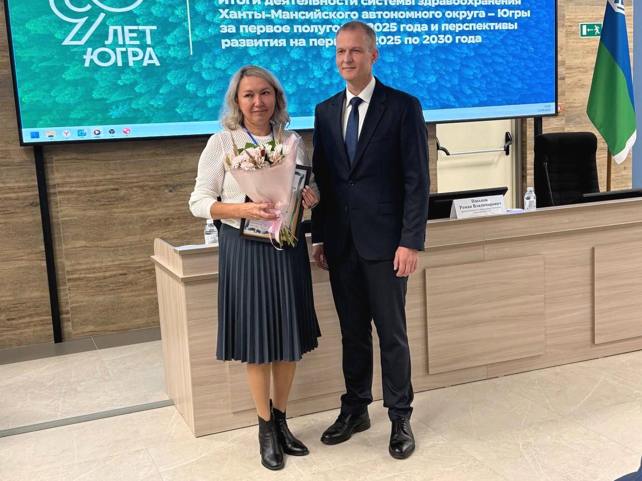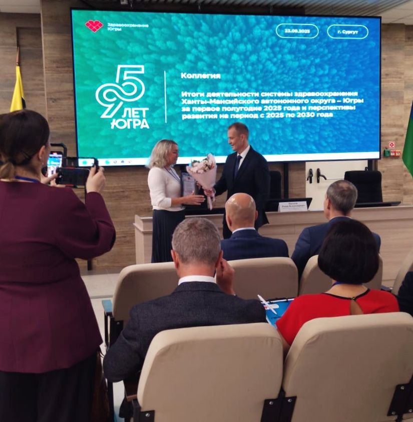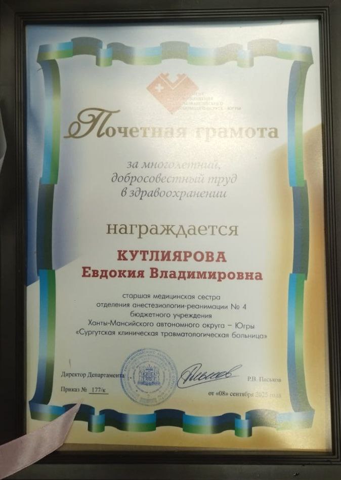 За многолетний добросовестный труд в медицине.Директор Департамента здравоохранения Югры Роман Паськов наградил медсестру-анестезиста Сургутской травмбольницы Евдокию Кутлиярову. С торжественной церемонии чествования медицинских работников сегодня начала свою работу коллегия Депздрава. Окружное мероприятие с участием главных врачей медицинских организаций и главных внештатных специалистов Департамента проходит в Сургуте, на базе Станции скорой медицинской помощи.
