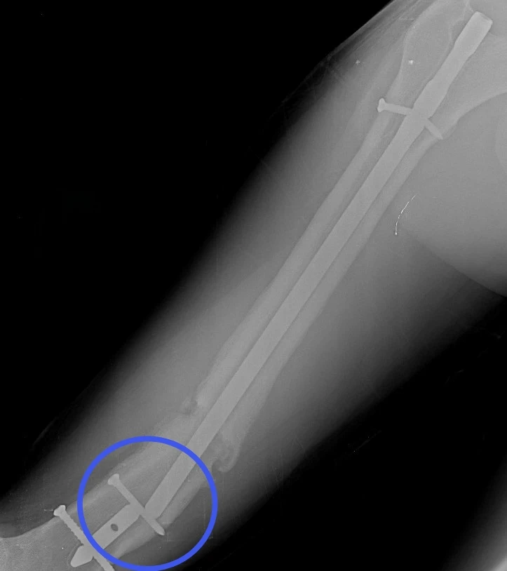 17‑летний Николай поступил к нам с осложнением после операции по поводу перелома бедра. Ранее ему был установлен интрамедуллярный штифт – для фиксации отломков кости с возможностью ранней нагрузки на конечность. Но прежде, чем перелом консолидировался, штифт сломался.