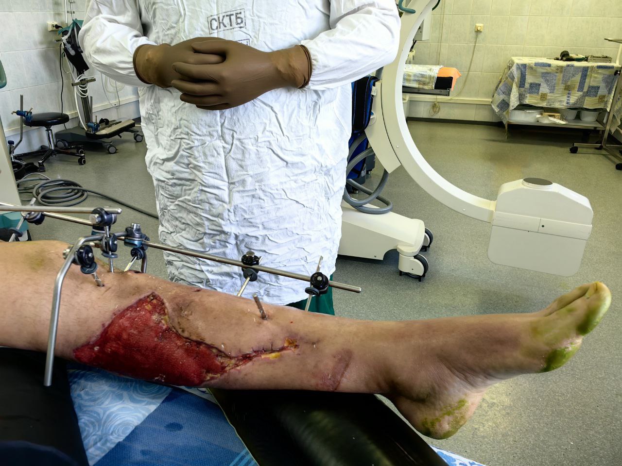 53-летний мужчина пострадал на производстве. Ему упала на ногу бетонная конструкция весом более 1,5 тонны. Тяжелые повреждения пришлись на левую голень: открытый перелом большеберцовой кости с размозжением мягких тканей и задней большеберцовой артерии, обширным дефектом кожи.