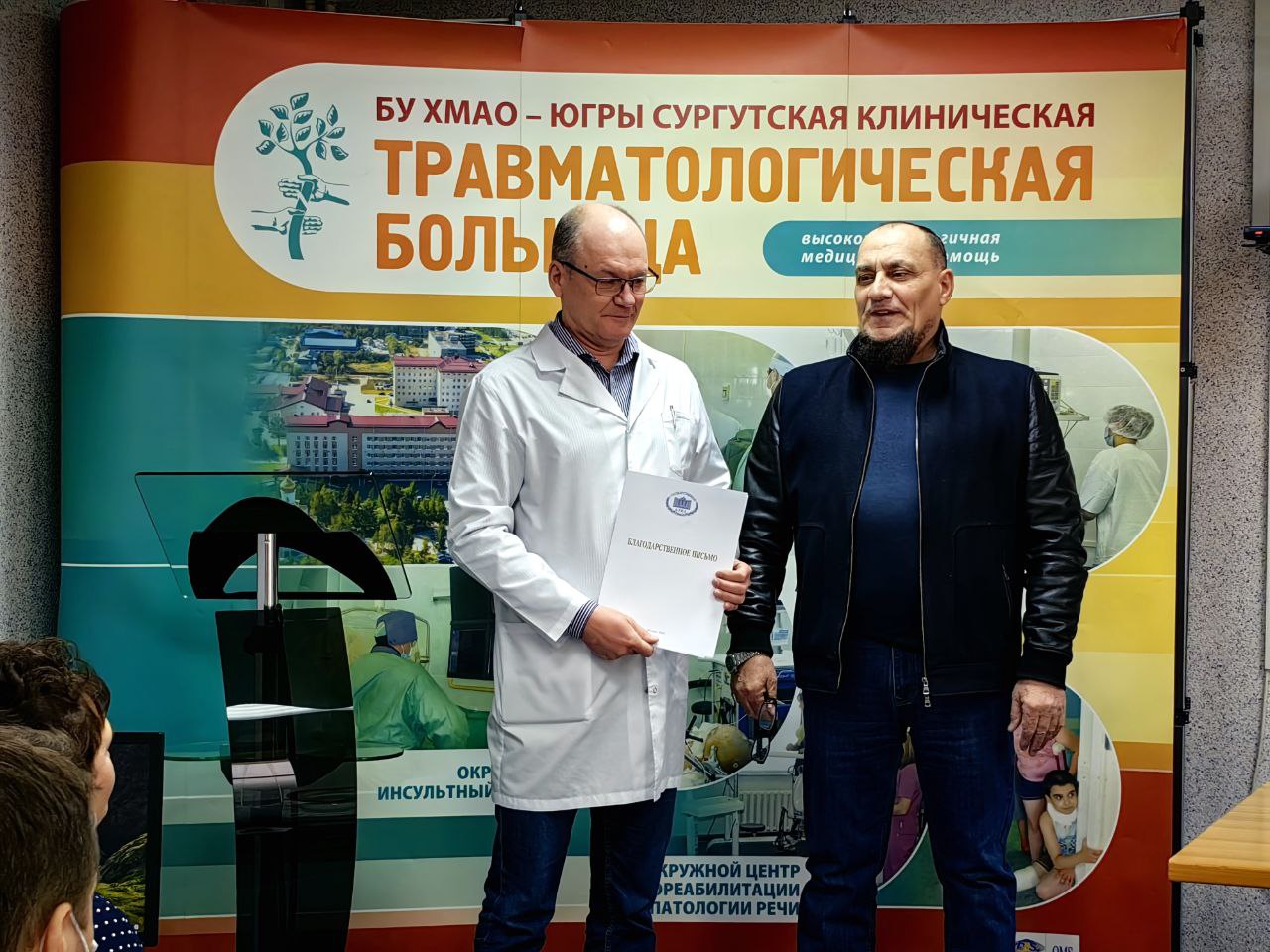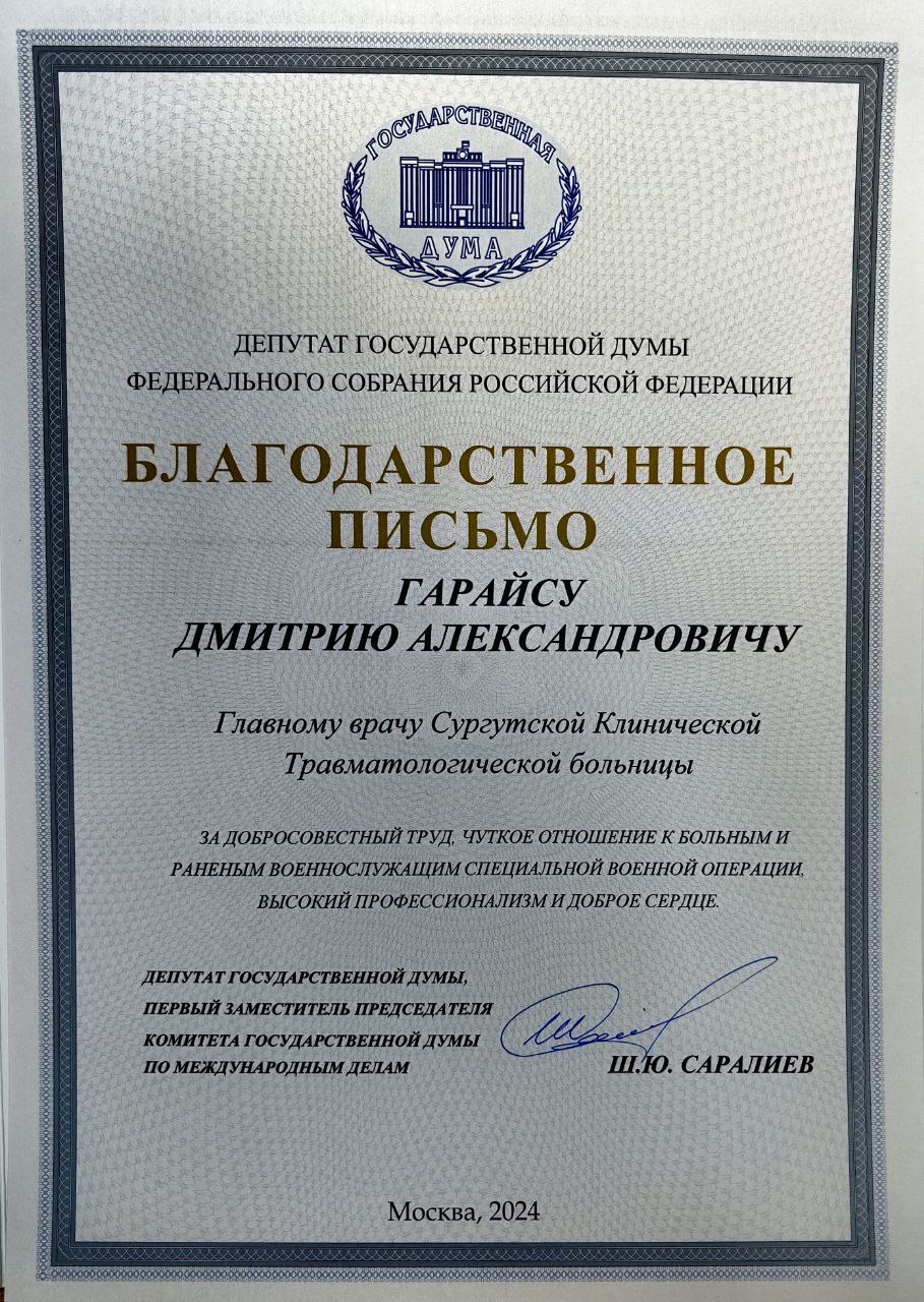 Добросовестный труд, чуткое отношение к раненым военнослужащим, высокий профессионализм и добросердечность медперсонала клиники отмечены на уровне Государственной Думы Российской Федерации. Нам поступило благодарственное письмо за подписью первого заместителя председателя Комитета ГД по международным делам Шамсаила Саралиева. Сегодня во время утренней планёрки главному врачу травмбольницы Дмитрию Гарайсу письмо передал первый заместитель официального представительства Главы Чеченской Республики в ХМАО-Югре Абубакар Заураев.