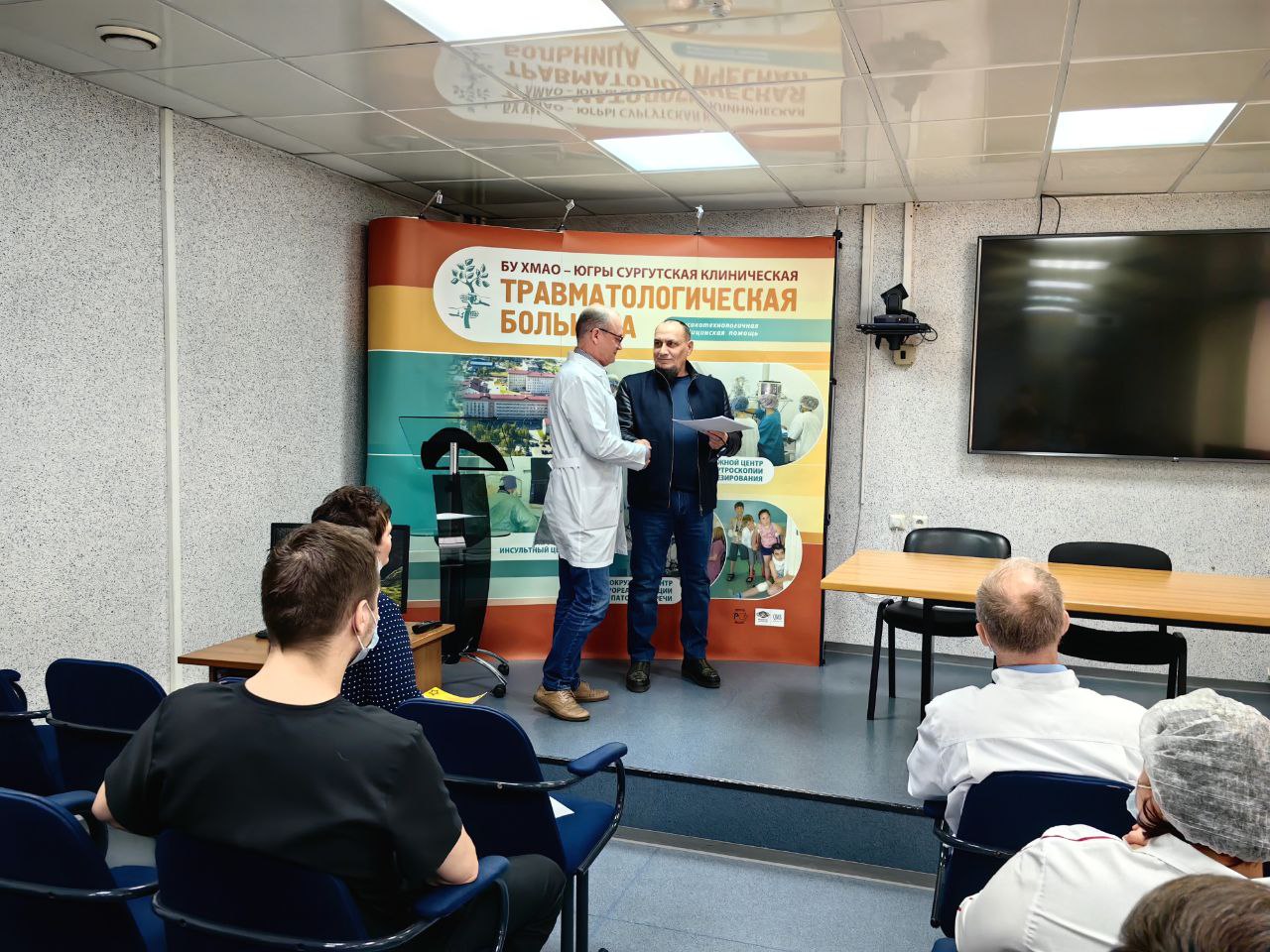 И сегодня же трое наших сотрудников удостоены персональной благодарности Ханты-Мансийской окружной общественной организации ветеранов войны, труда, Вооруженных Сил и правоохранительных органов. За организацию регулярных благотворительных сборов гуманитарной помощи бойцам СВО отмечены главная медицинская сестра Яна Баранова, инструктор-методист ЛФК Сергей Двуличанский и врач-методист Екатерина Петрова.