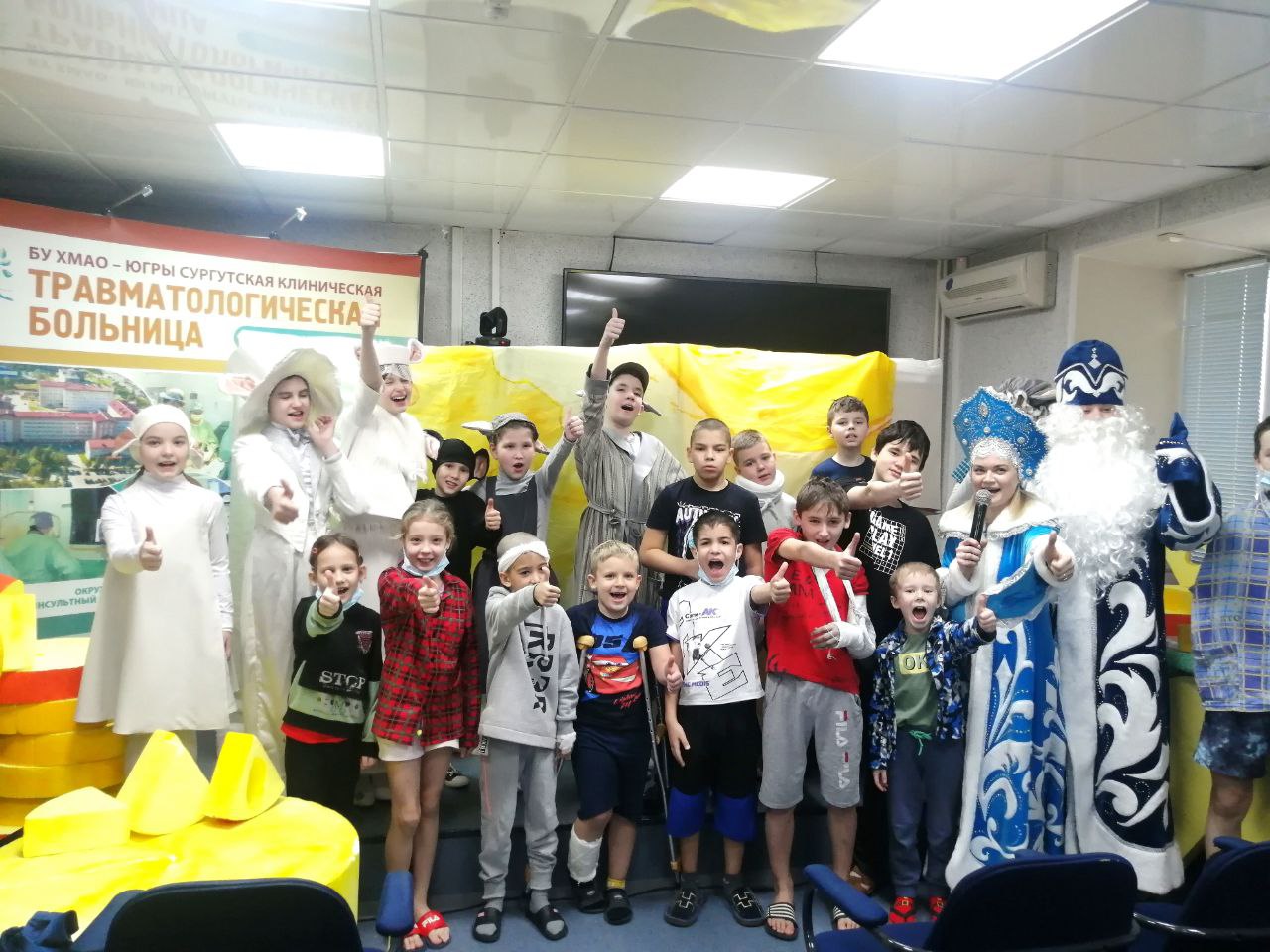 Сам спектакль не новогодний, но театралы заранее позаботились о дополнительной развлекательной программе с участием Деда Мороза и Снегурочки. Главные герои праздника передали нашим пациентам подарки от коллектива Сургутского ЗСК (филиал ООО «Газпром переработка»). В декабре профсоюз предприятия объявил благотворительный сбор в рамках акции «Коробка храбрости», и в преддверии Нового года детским отделениям травмбольницы была отправлена целая партия игрушек и канцтоваров. Выражаем признательность всем, кто помнит о больных детях и старается подарить им хорошее настроение!