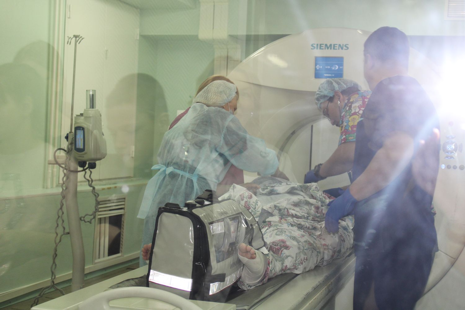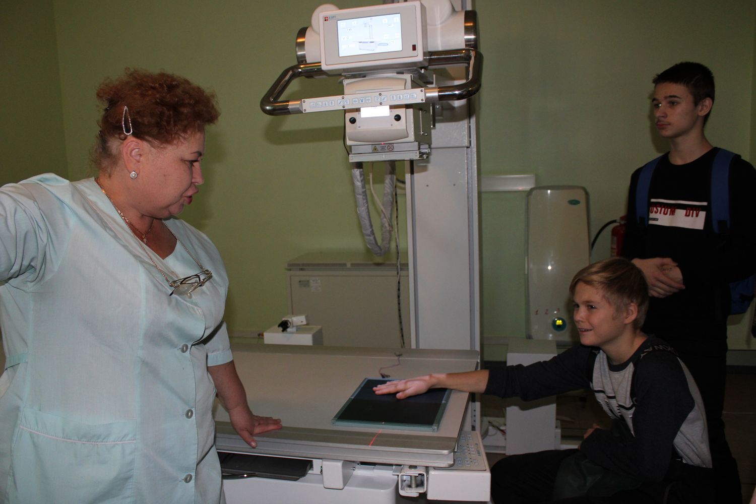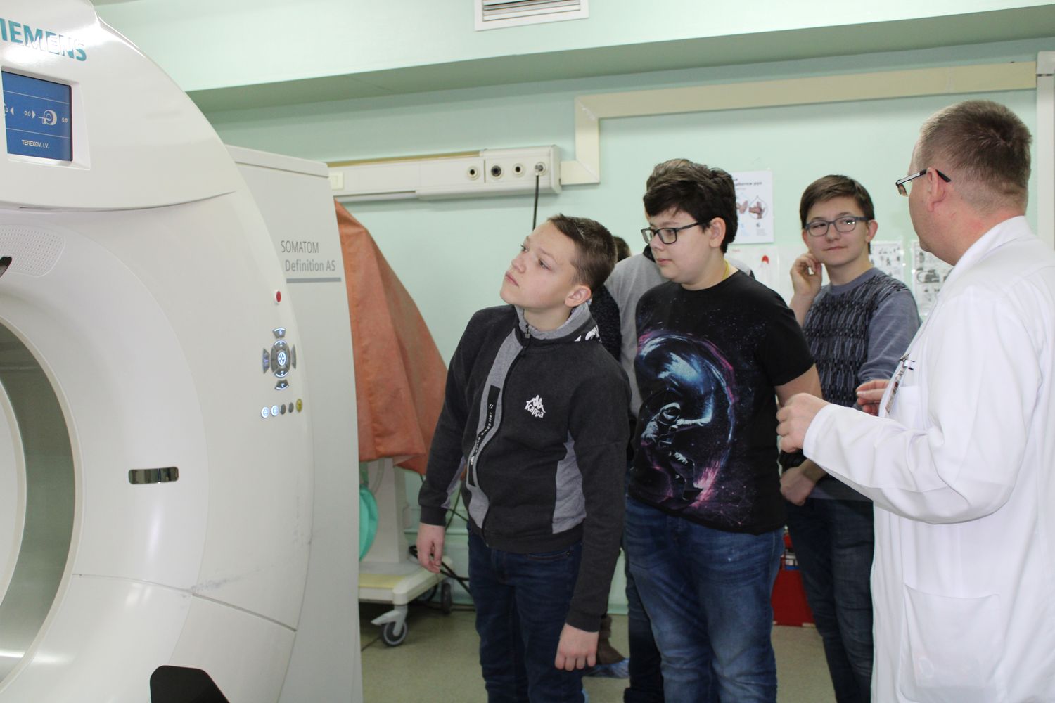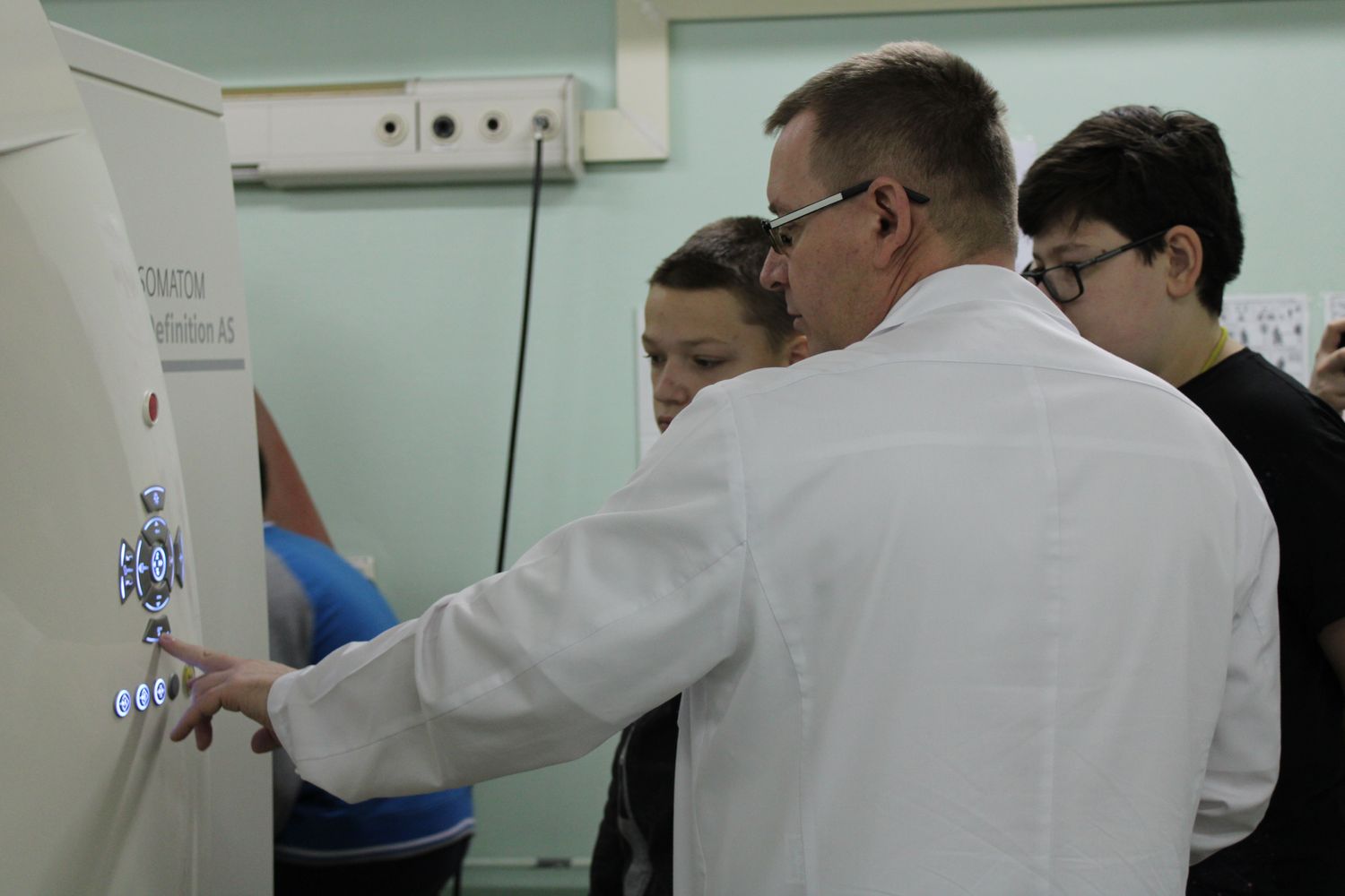 После школьники отправились в кабинет, где установлен компьютерный томограф. Работе высокотехнологичного оборудования мальчишкам и девчонкам показал заведующий рентгенологическим отделением Александр Жидяев. Врач рассказал о функциях и возможностях аппарата, познакомил с системой чтения снимков, 3D-моделированием изображений. Но экскурсию пришлось приостановить: привезли на исследование пациента из реанимационного блока…