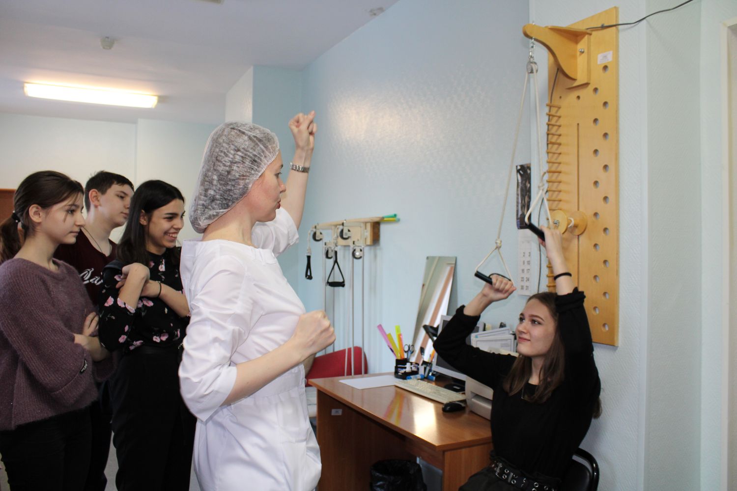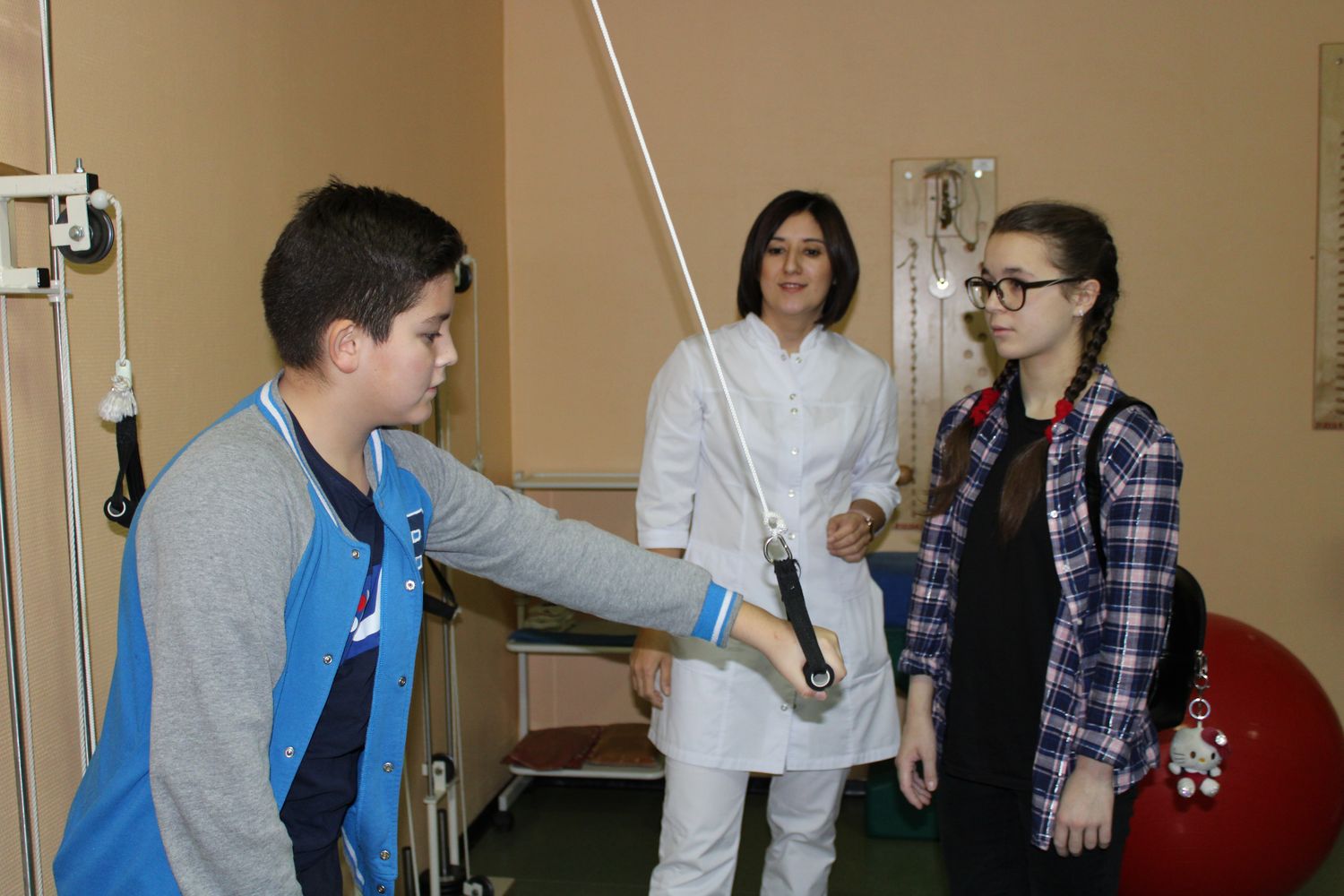 В Центре нейрореабилитации школьники посетили занятия по лечебной физкультуре, бассейн. Заведующая отделением Альбина Гилязова рассказала ученикам, что отделение было открыто более 15 лет назад для лечения пациентов с черепно-мозговой травмой, переломами позвоночника, с заболеваниями нервной системы или после инсульта.