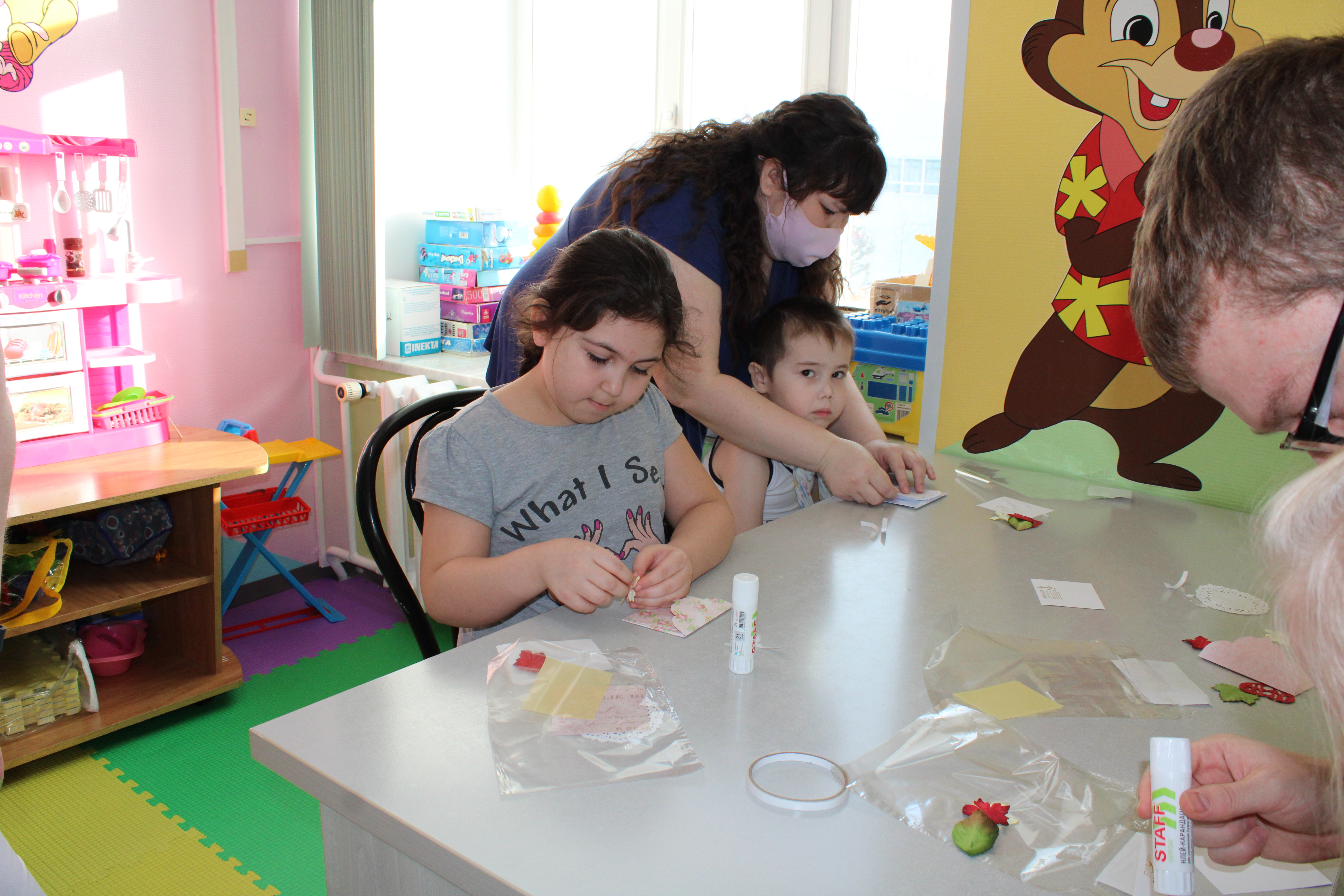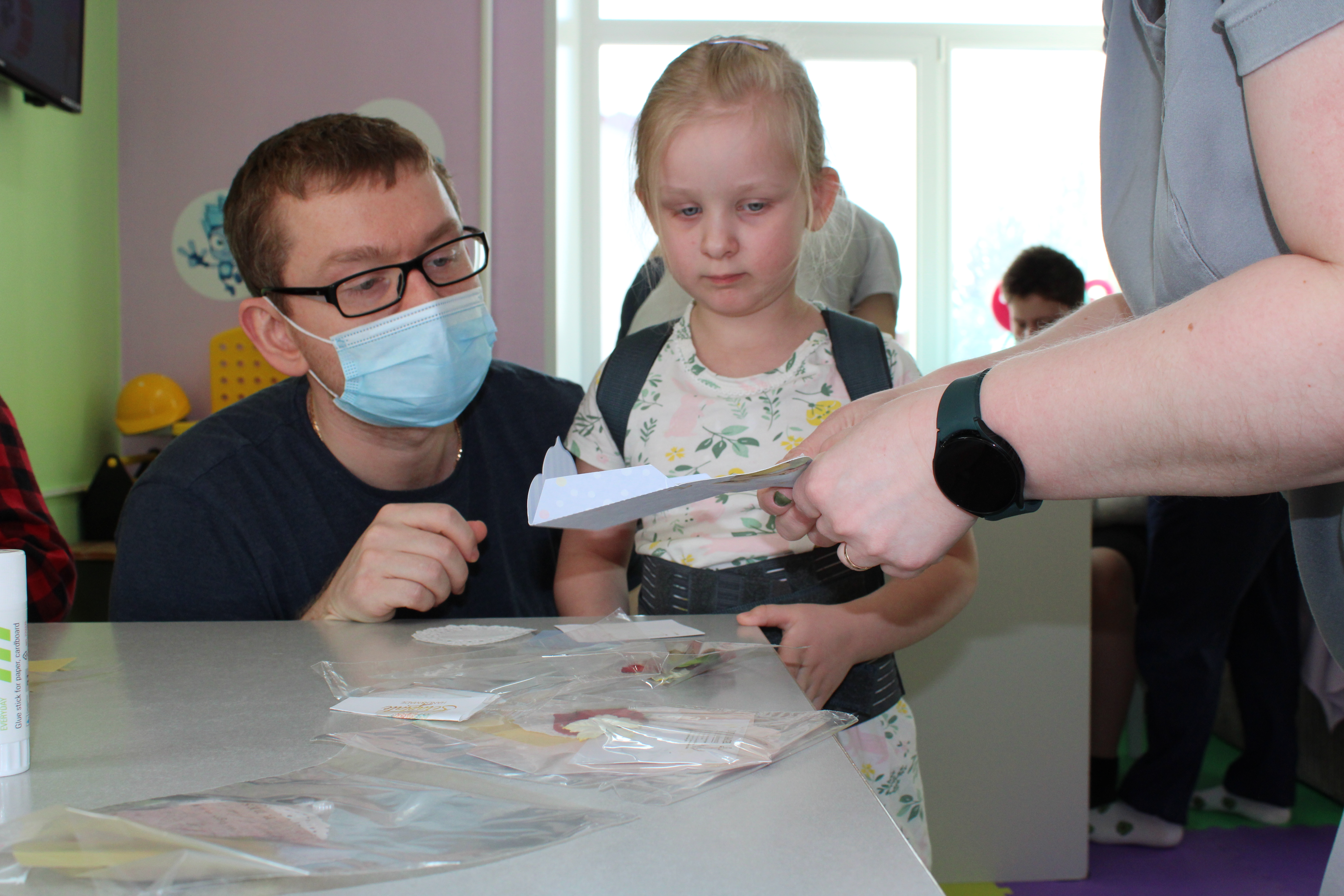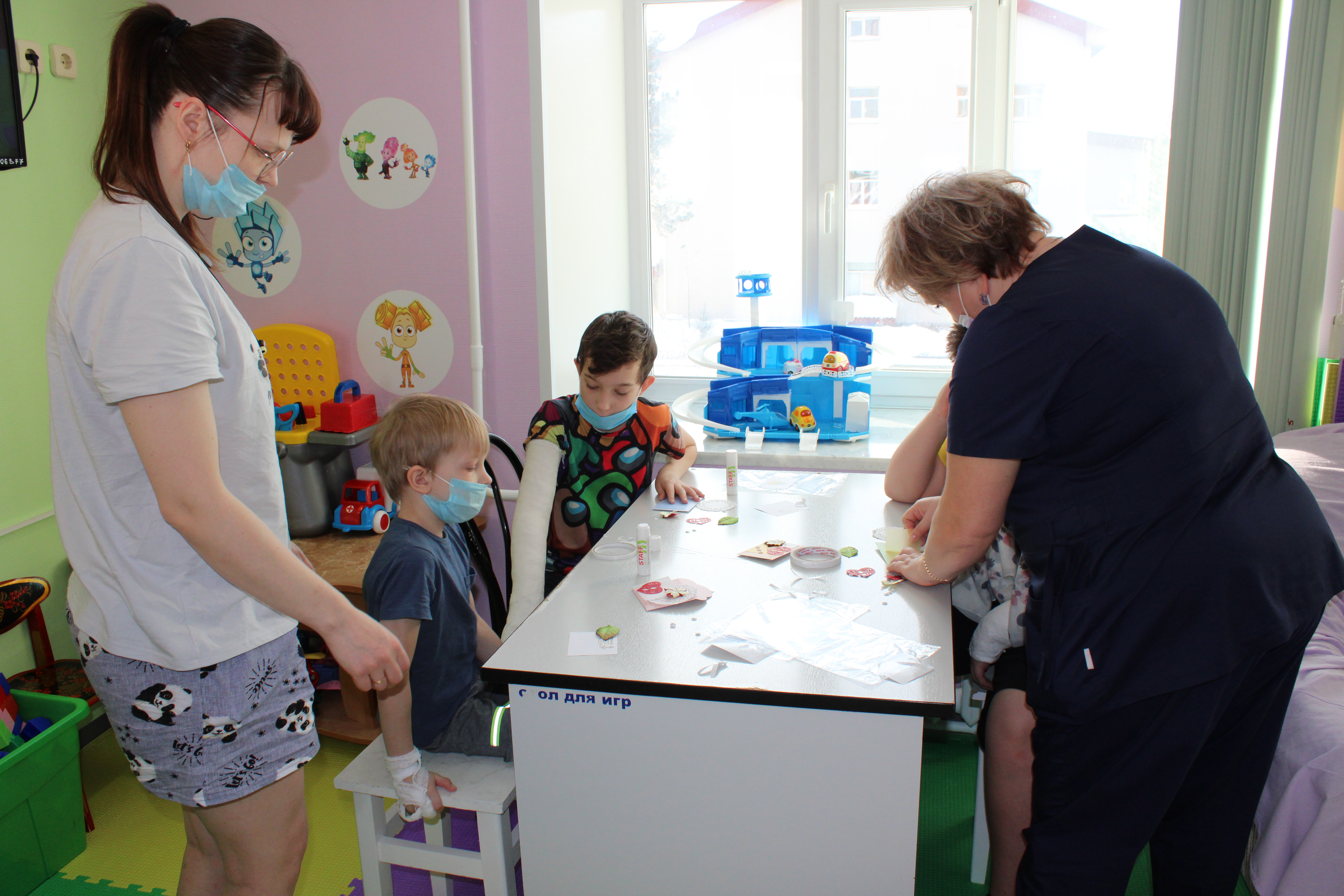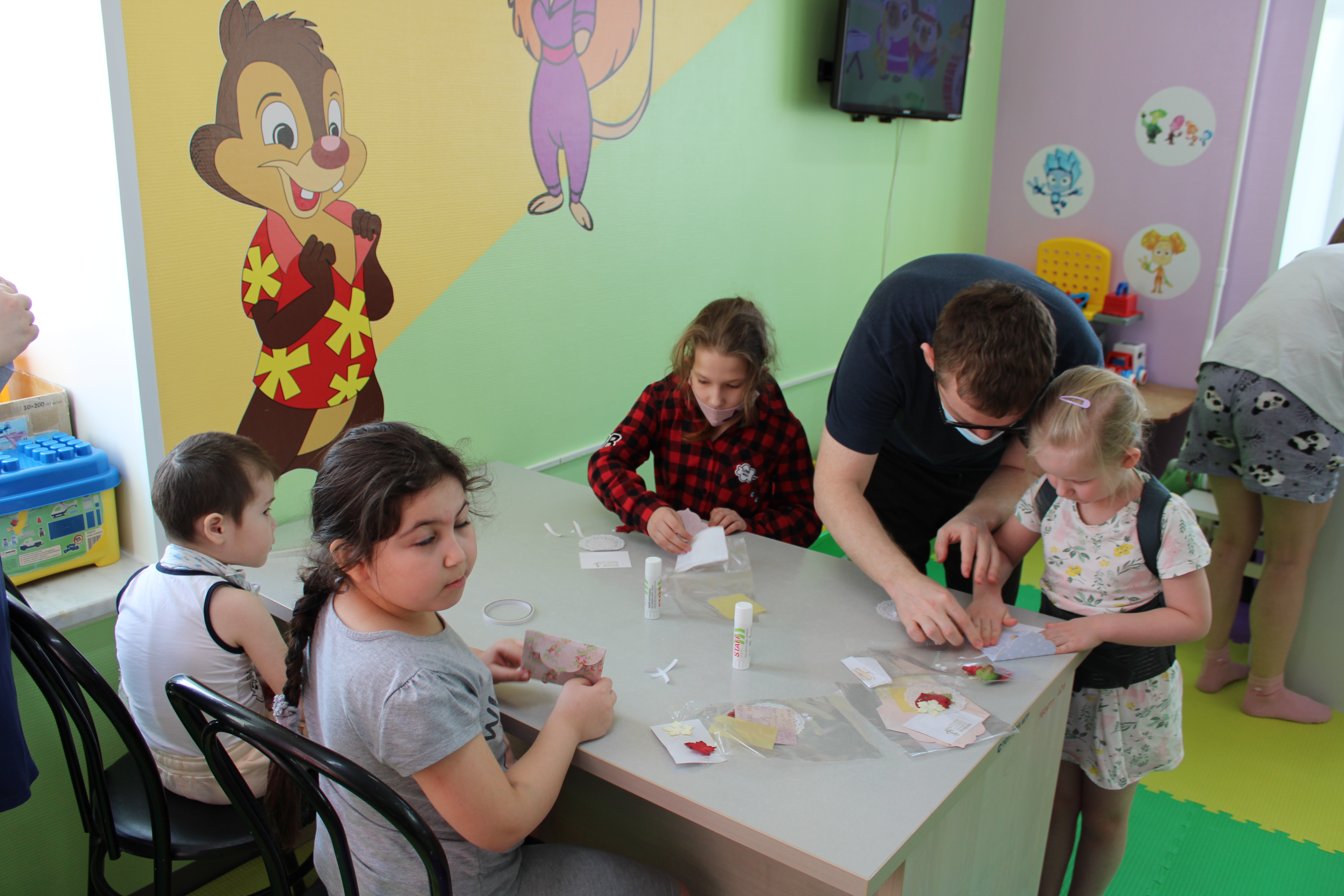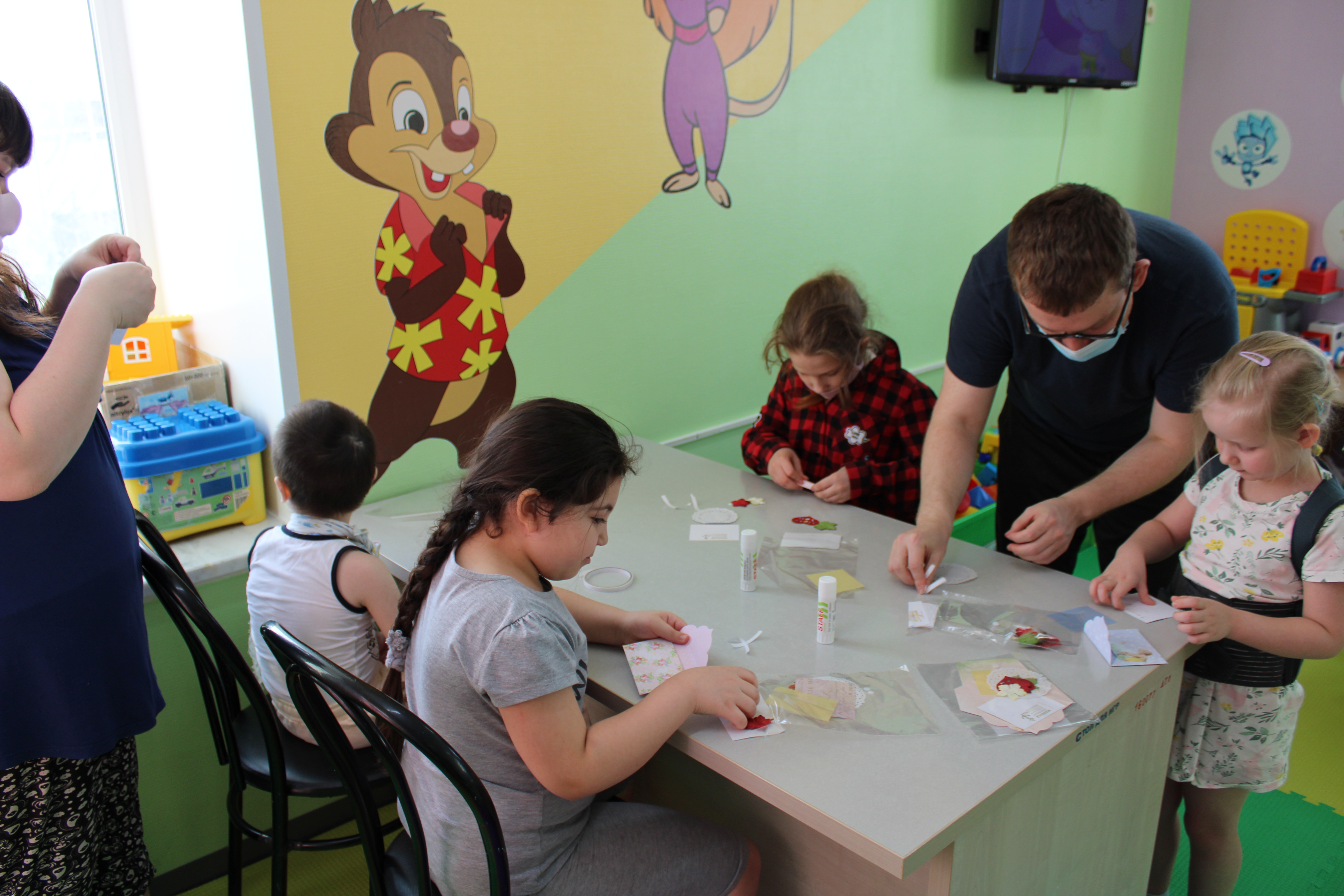 Из соображений безопасности и для удобства детей, многие из которых не могут полноценно работать руками из-за гипса и повязок, все необходимые элементы Оксана Бакуменко подготовила заранее. Поэтому детворе было достаточно лишь клея и двухстороннего скотча, чтобы собрать поделку. Такие занятия всегда пользуются популярностью не только у наших юных пациентов, но и их родителей. К творческому процессу подключились даже папы.
