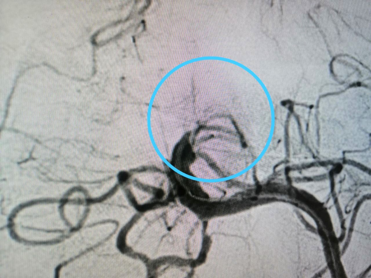 Обследование показало, что у пациента закупорен один из главных сосудов головного мозга – базилярная артерия. На фото №1 хорошо видно место, где резко обрывается кровоток. При тромбозе базилярной артерии летальность достигает 95%, а больше половины выживших обречены на глубокую инвалидность, вплоть до вегетативного состояния. Только при оказании своевременной и грамотной специализированной медицинской помощи появляются шансы на спасение. Пациента подняли в рентген-операционную, где заведующему отделением рентгенохирургических методов диагностики и лечения Максиму Бессмертных вместо планируемой одной операции пришлось в экстренном порядке выполнить сразу три.