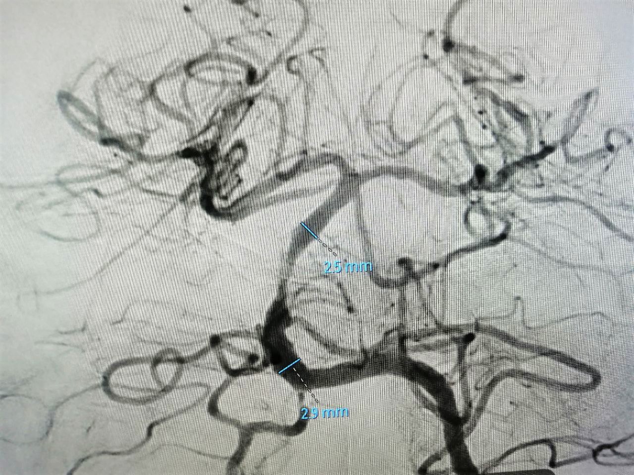 Специалист быстро удалил тромб. Но появившийся кровоток обозначил другую проблему – субокклюзию базилярной артерии. На участке длиной 8 миллиметров она представляла собой тонкую ниточку (фото №2). При таком сужении не только не возобновилось бы полноценное питание структур головного мозга, но и вновь образовался бы тромб. Причем, закупориваться просвет начал тут же, буквально на глазах рентгенохирурга.