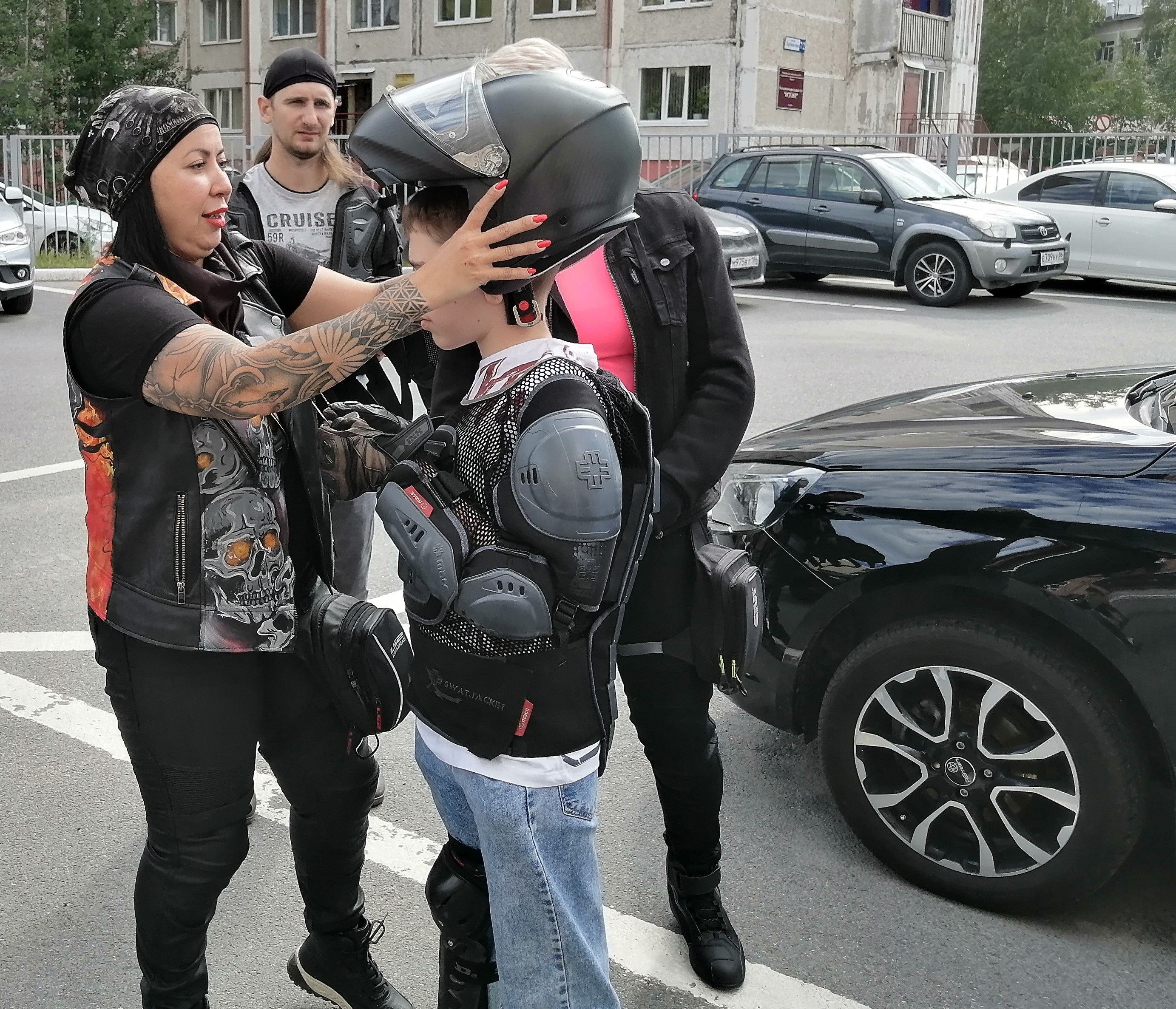 При этом чтобы надеть байкерское снаряжение, выстроилась целая очередь. Ребята с удовольствие мерили шлемы, наколенники, щитковую защиту для торса – моточерепаху, перчатки. Признались, что даже такая массивная, предназначенная для взрослых атрибутика оказалась лёгкой, удобной и не ограничивающей движения.