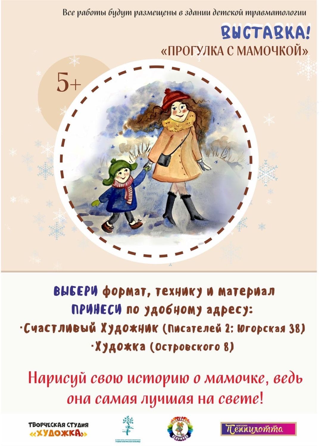 Травматологическая больница Сургута и городские студии «Счастливый̆ художник» и «Художка» продолжают добрую традицию! Приглашаем сургутян стать авторами и главными героями творческой выставки «Прогулка с мамочкой̆». Условия простые: нарисуй̆ историю о маме в любой̆ технике.