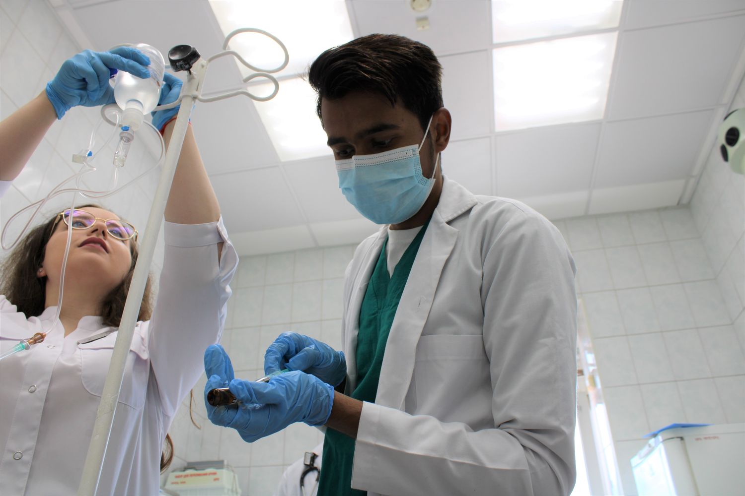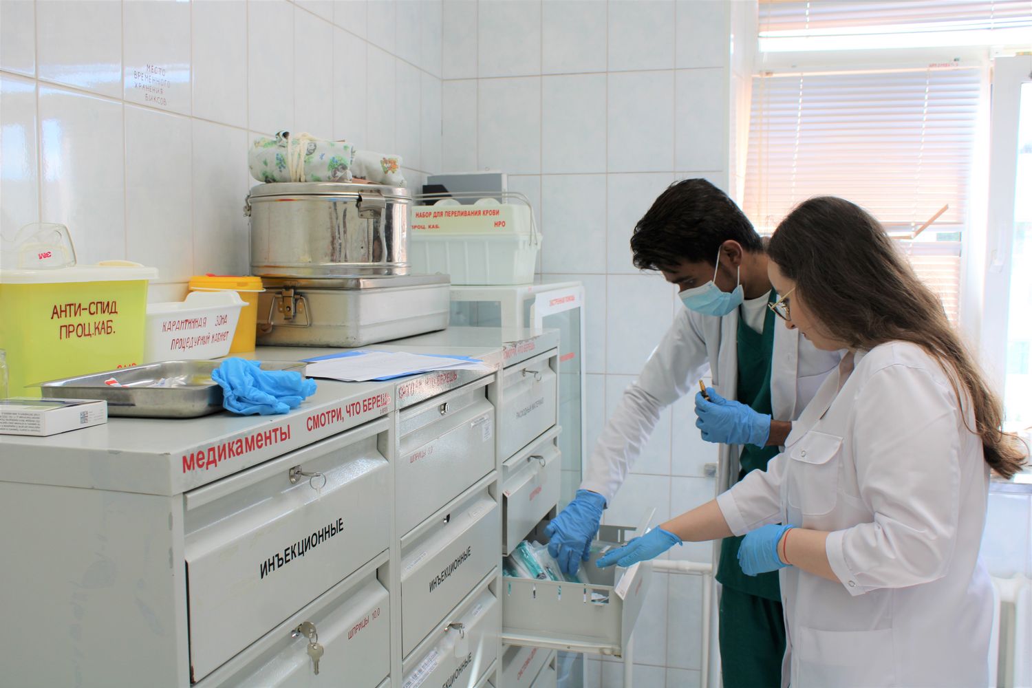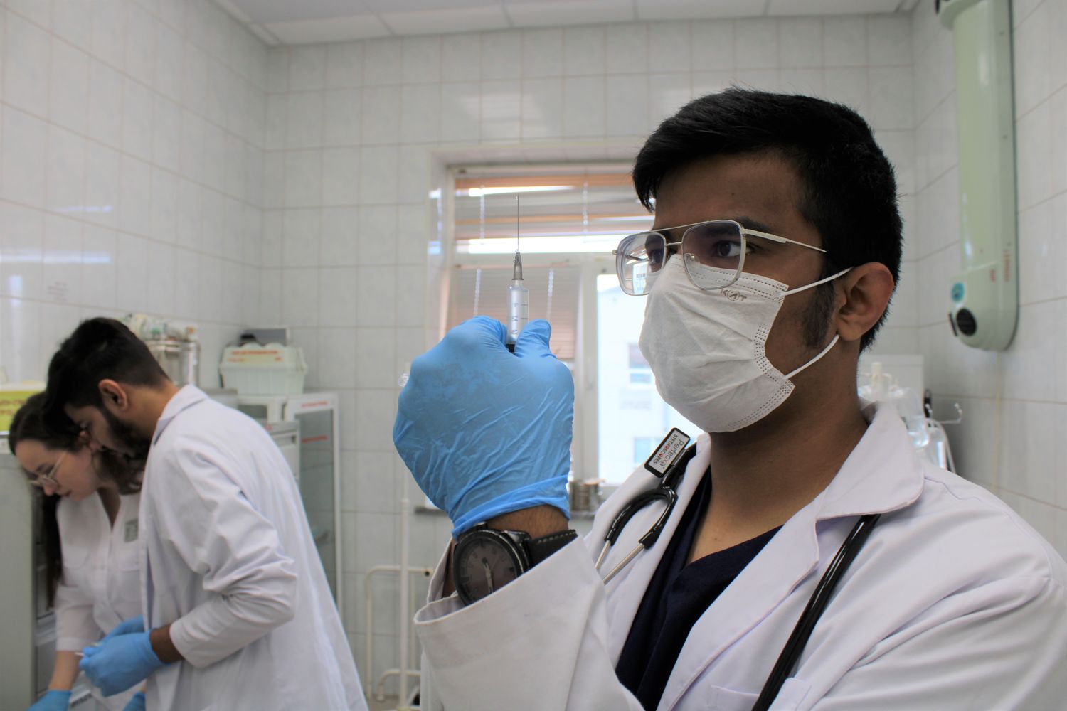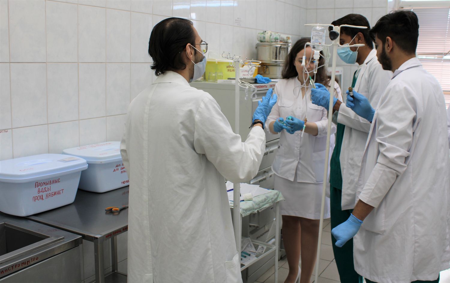 Студенты посещают больницу небольшими группами. На третьекурсниках – работа помощника процедурной медсестры. Выполняют внутривенные и внутримышечные инъекции, проводят забор крови для исследований, помогают приводить в порядок процедурный кабинет, измеряют давление, температуру тела и другие показатели.