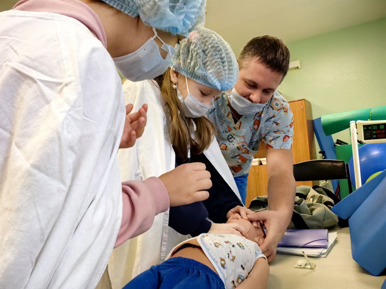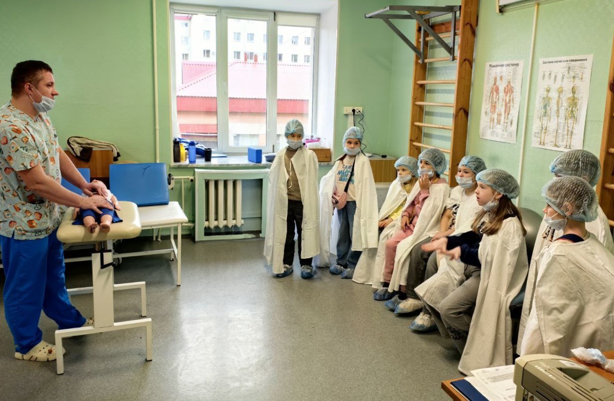 Под руководством медбрата детского отделения анестезиологии и реанимации Вадима Держи пробовали проводить сердечно-лёгочную реанимацию. Искусственное дыхание и непрямой массаж сердца отрабатывали на современном манекене. Он имеет различные элементы для реалистичной практики и позволяет отслеживать силу нажатий на грудную клетку. Поэтому ребята сразу могли оценить свои успехи и при необходимости скорректировать свои действия.