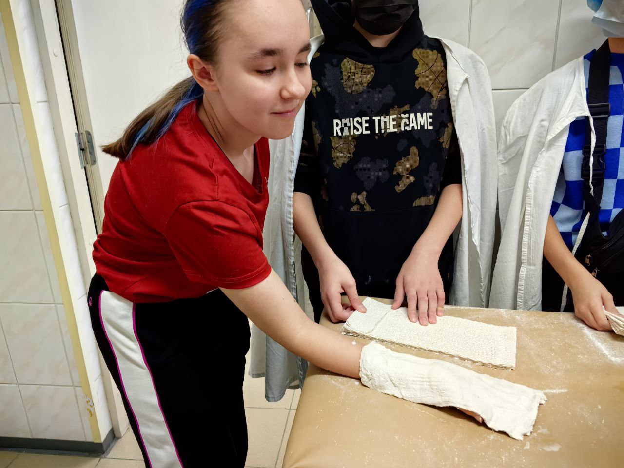 А на мастер-классе от медсестры-гипсового техника Анастасии Большаковой манекены не понадобились. Наложение гипсовой лонгеты отрабатывали друг на друге. Своими руками школьники почувствовали, как ведёт себя материал при взаимодействии с водой. Несмотря на то, что затвердевание происходит очень быстро, все успели придать повязке нужную форму.