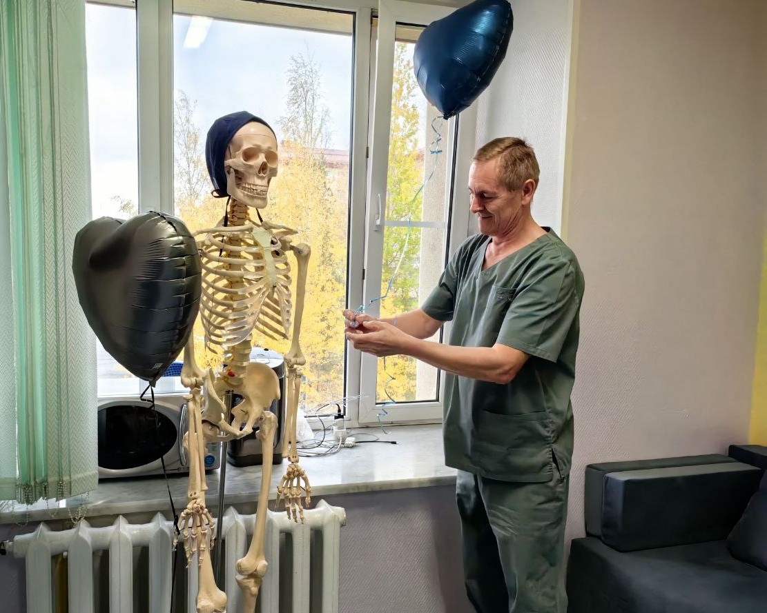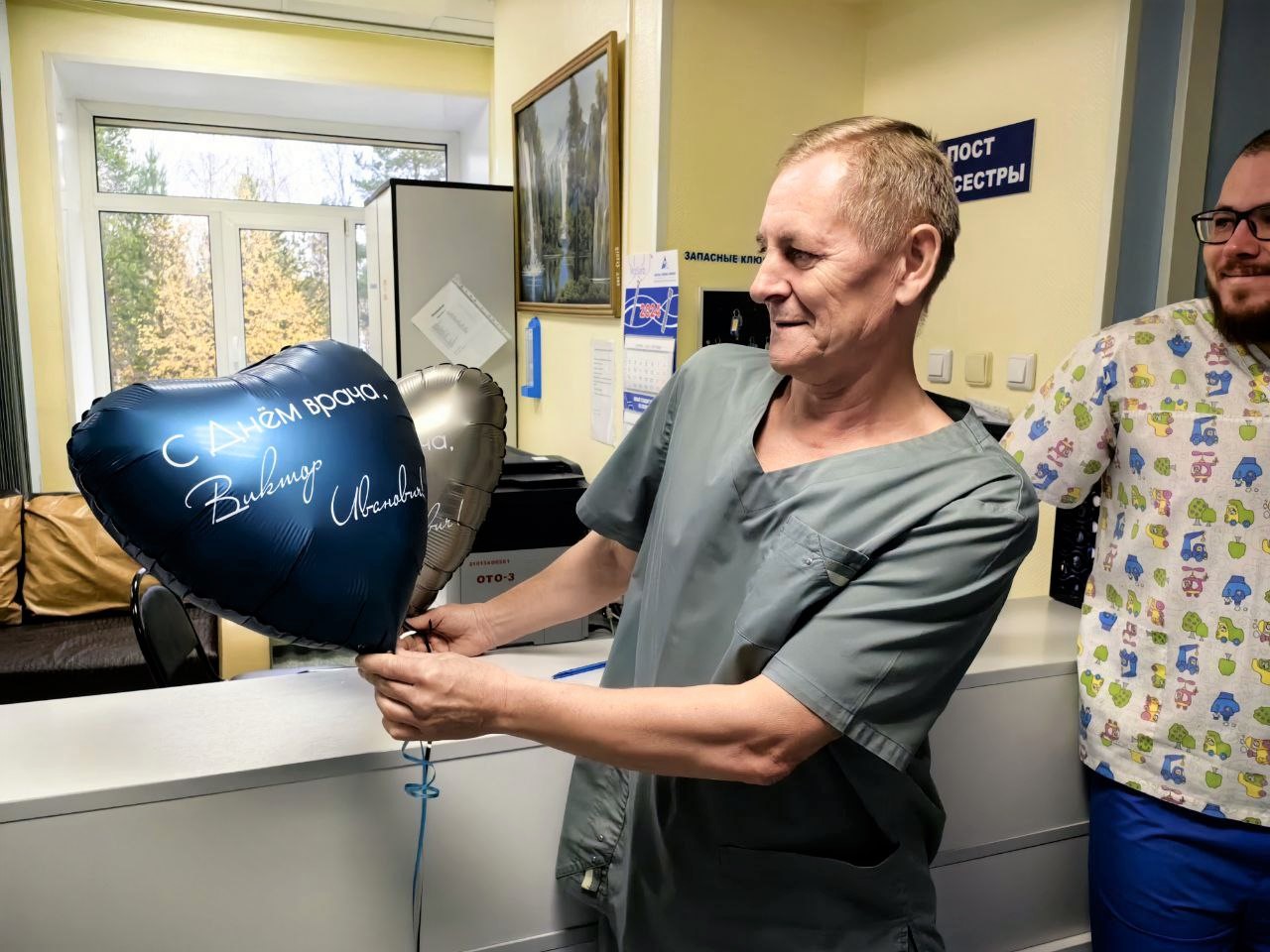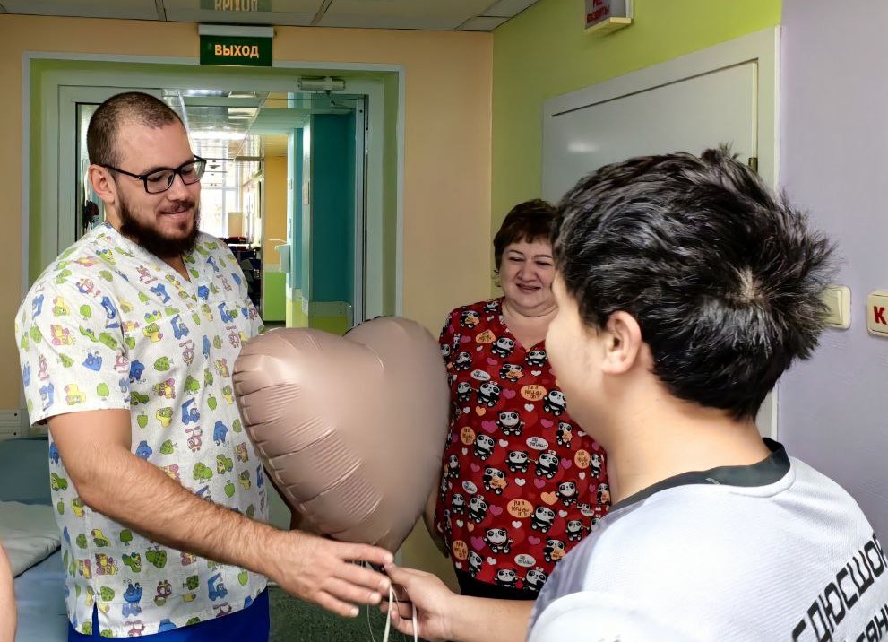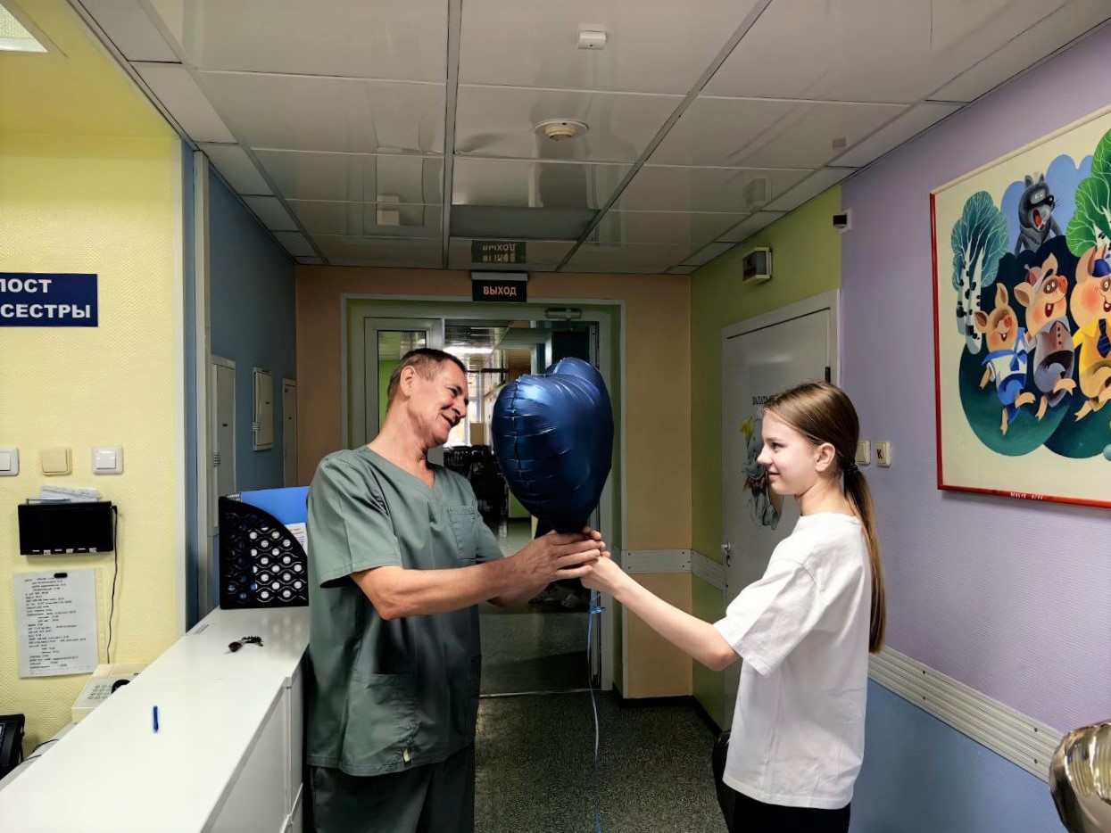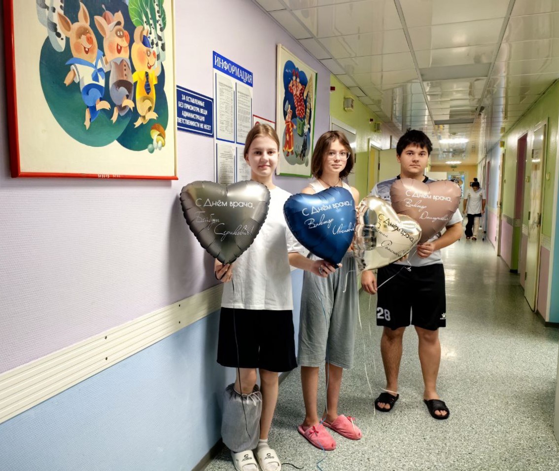 Идея выразить признание врачам появилась у 15-летней пациентки Анастасии Чугуновой. В конце мая она травмировала ногу и с тех пор уже в третий раз проходит курс лечения в стационаре. За профессионализм, отзывчивость и поддержку благодарна всей врачебной команде: заведующему отделением Виктору Овчарову, травматологам-ортопедам Бейбуту Байтенову, Виктору Денисову, Данилу Строеву. Настя заранее попросила свою маму Юлию Андреевну заказать и доставить в больницу воздушные шары. К сегодняшнему утру всё было готово, и девушка пригласила пациентов из своей и соседних палат присоединиться к поздравлениям.