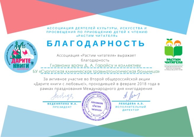 Напомним, что коллектив учреждения принял участие в Общероссийской акции «Дарите книги с любовью», которая приурочена к Международному дню книгодарения. Всего акция объединила более 70 регионов России . Медицинские работники Травмбольницы Сургута собрали более 40 книг для детей и подростков, которые переданы в региональную организацию помощи инвалидам «Седьмой лепесток», общественную организацию многодетных семей «Многодетки из Югры», центр социальной помощи семье и детям «Апрель», центр социального обслуживания населения «На Калинке». Сотрудники Травматологической больницы приобрели для детей литературные сборники. Среди произведений - «Телефон» Корнея Чуковского, «Игрушки» Агнии Барто, рассказы и были Льва Толстого, а также издания для самых маленьких – книжки-малышки, для подростков - энциклопедии.