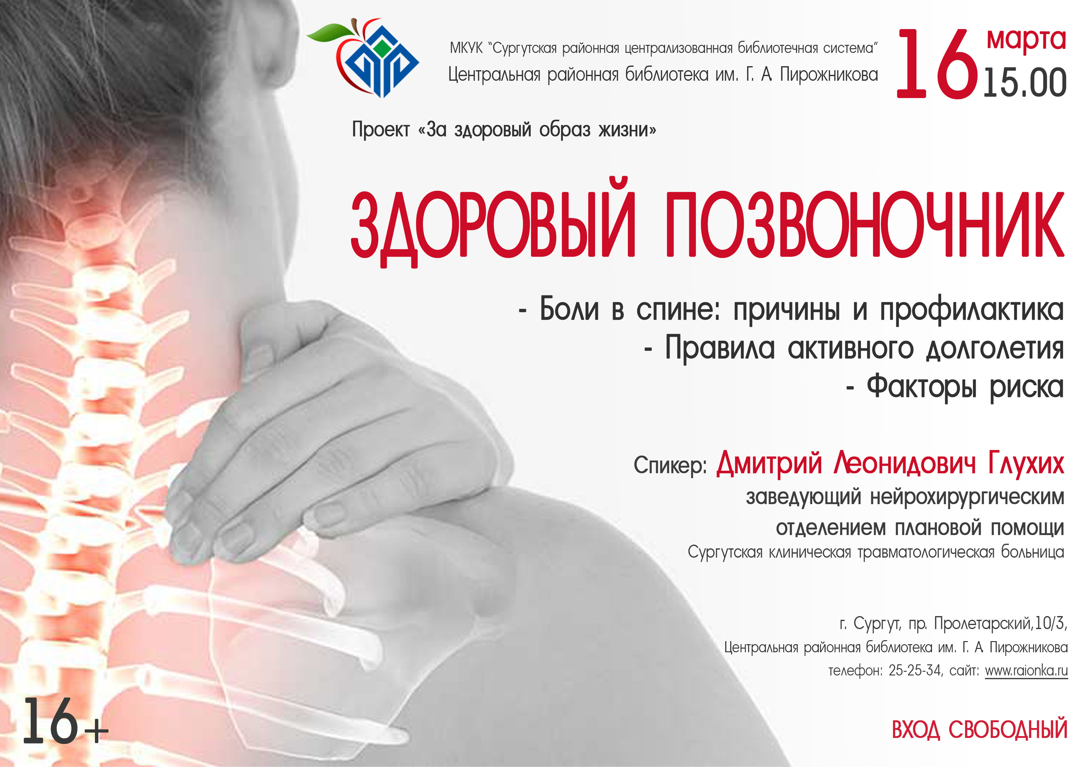 Откроет проект с первой лекцией заведующий нейрохирургическим отделением плановой помощи Сургутской клинической травматологической больницы Дмитрий Глухих. Врач расскажет о причинах и профилактике болей в спине, правилах активного долголетия и факторах риска. Встреча пройдет 16 марта в 15.00 в Центральной районной библиотеке им. Г. А. Пирожникова