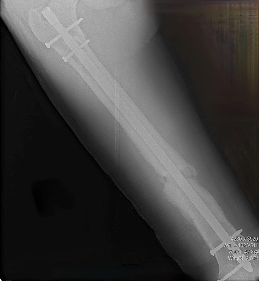 17‑летний Николай поступил к нам с осложнением после операции по поводу перелома бедра. Ранее ему был установлен интрамедуллярный штифт – для фиксации отломков кости с возможностью ранней нагрузки на конечность. Но прежде, чем перелом консолидировался, штифт сломался.
