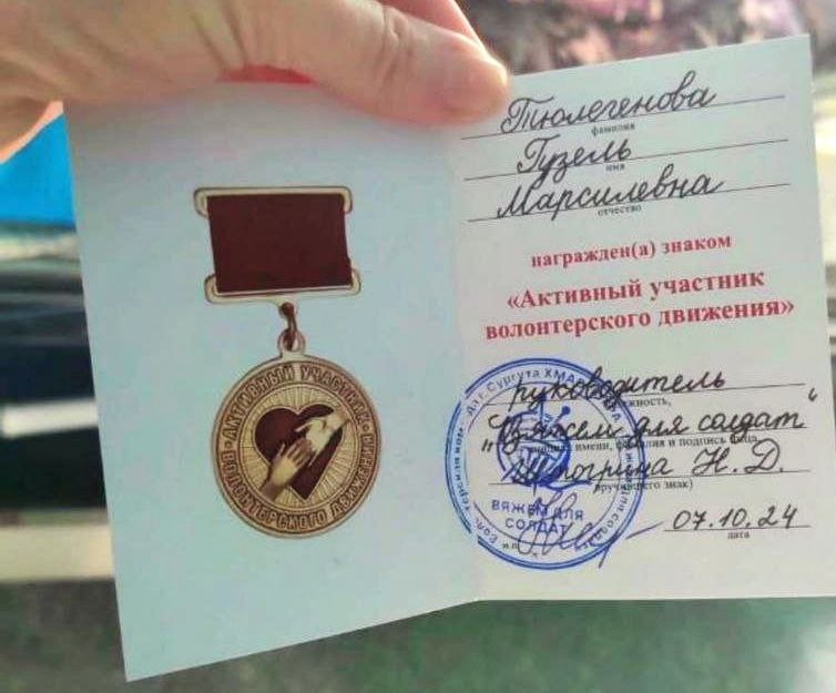 Несмотря на свою маломобильность, Гузель находит силы помогать другим. Два года принимает участие в благотворительных акциях по сбору всего необходимого для фронта. На днях ей прямо в больнице под аплодисменты и поздравления сотрудников вручили почетный знак «Активный участник волонтерского движения».
