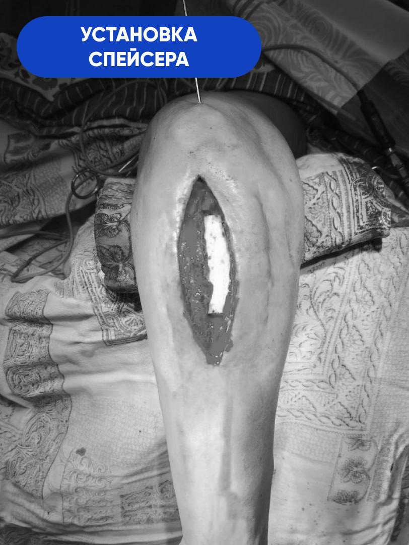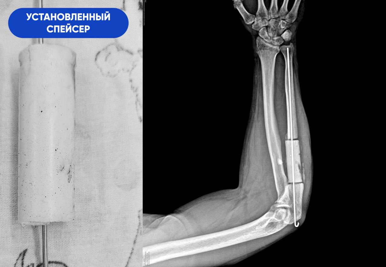 -В первую очередь нам необходимо было справиться с инфекцией. При свищевом остеомиелите ждать результата от обычной антибактериальной терапии бессмысленно. Воспалительный процесс разрушил кость на участке длиной 8 сантиметров. Этот фрагмент подлежал удалению в пределах здоровых тканей. На его место установили спейсер из антибиотика и костного цемента. Мы изготовили его самостоятельно в условиях операционной, по собственной технологии и индивидуальным размерам. Имплантат выполнял двойную задачу. Во-первых, это источник антибиотика в непосредственном очаге заражения. Во-вторых,- механическая поддержка для кости за счёт своей армирующей функции, - объясняет Сергей Глиняный.