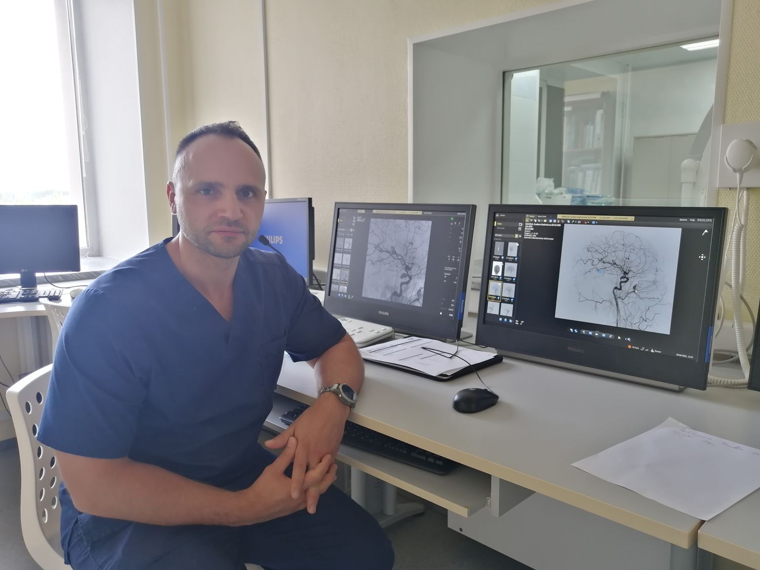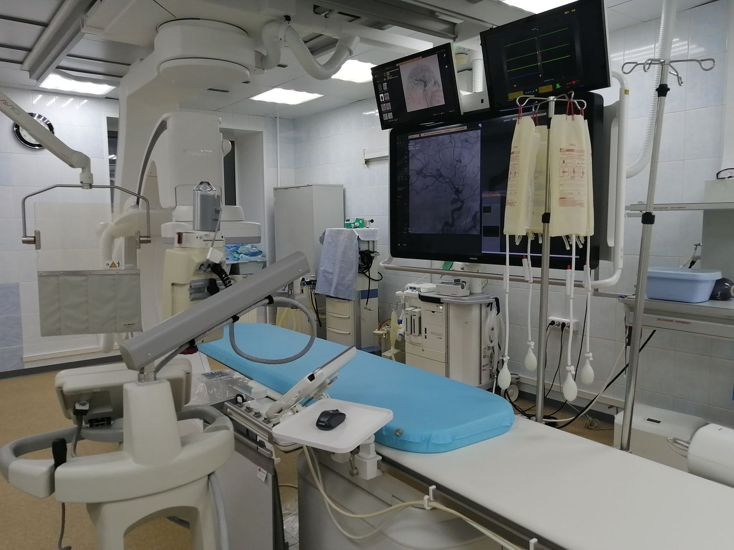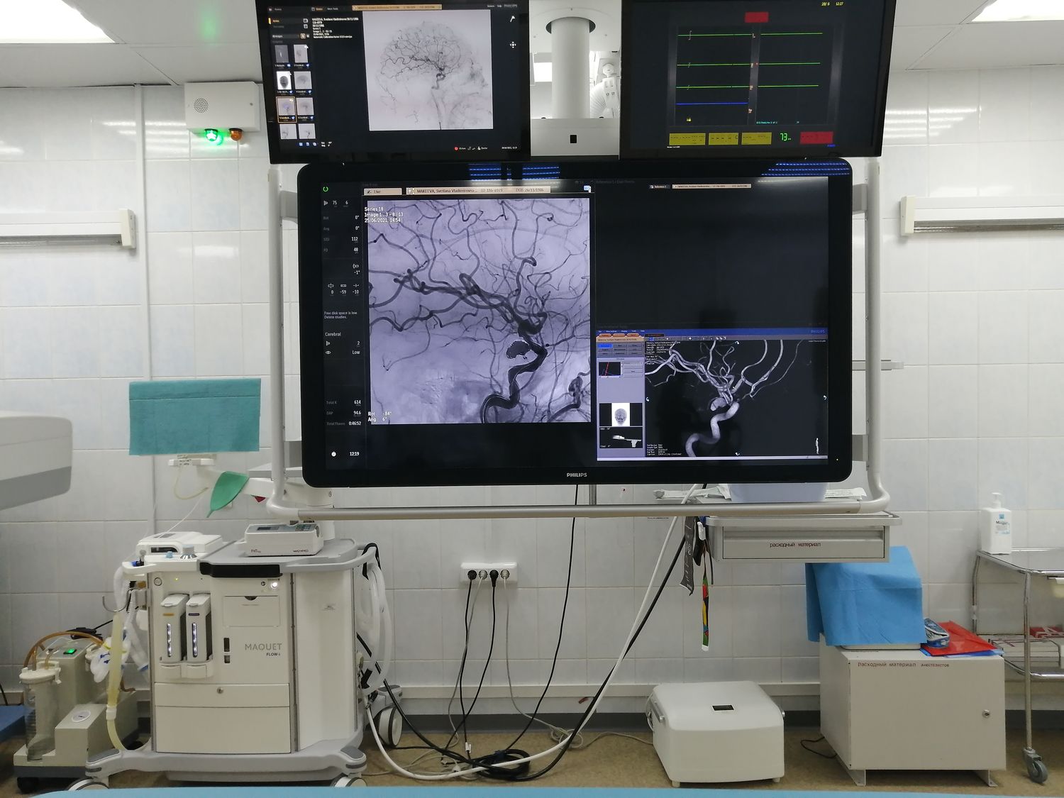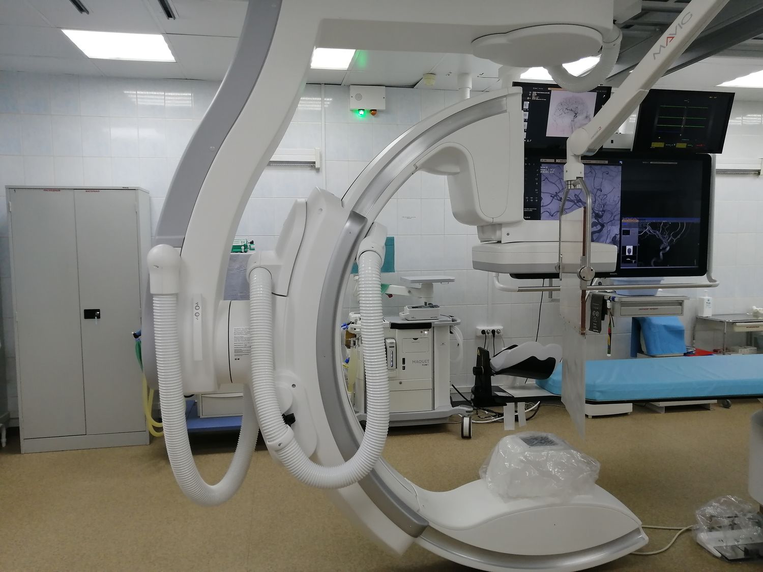 Многие сосуды головного мозга всего миллиметр в диаметре. Они образуют целые клубки, где происходят кровоизлияния и появляются гематомы. Чтобы разглядеть очаг и с максимальной точностью доставить туда стенты и другой инструментарий, хирургам необходимо как можно лучше видеть проблемный участок. Ангиограф даёт такую возможность – изображение выводится на большой экран, а высокое разрешение позволяет многократно увеличивать картинку. При этом лучевая нагрузка для пациента незначительная. По сравнению с прежним аппаратом, она в 10 раз меньше и сегодня сравнима с дозой облучения обычного флюорографа.