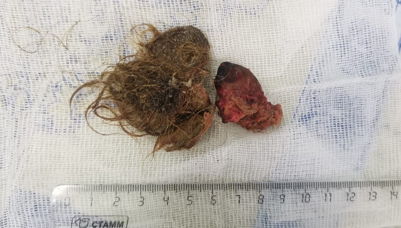 Ещё не зная о содержимом опухоли, нейрохирург Дмитрий Марченко столкнулся с серьезными сложностями во время операции. Крупное образование размером 5 на 7 сантиметров располагалось в задней черепной ямке и доходило до второго шейного позвонка. Здесь, в месте соединения спинного и головного мозга, много жизненно важных центров, отвечающих, в том числе, за дыхание, сердцебиение, сознание. Врач мастерски выполнил опасное вмешательство, полностью удалив опухоль. О её особенностях стало известно после извлечения. Ни самому Дмитрию Марченко - врачу-нейрохирургу с 15-летним стажем, ни его гораздо более опытным коллегам по травмбольнице до этого случая не приходилось иметь дело с тератомой.