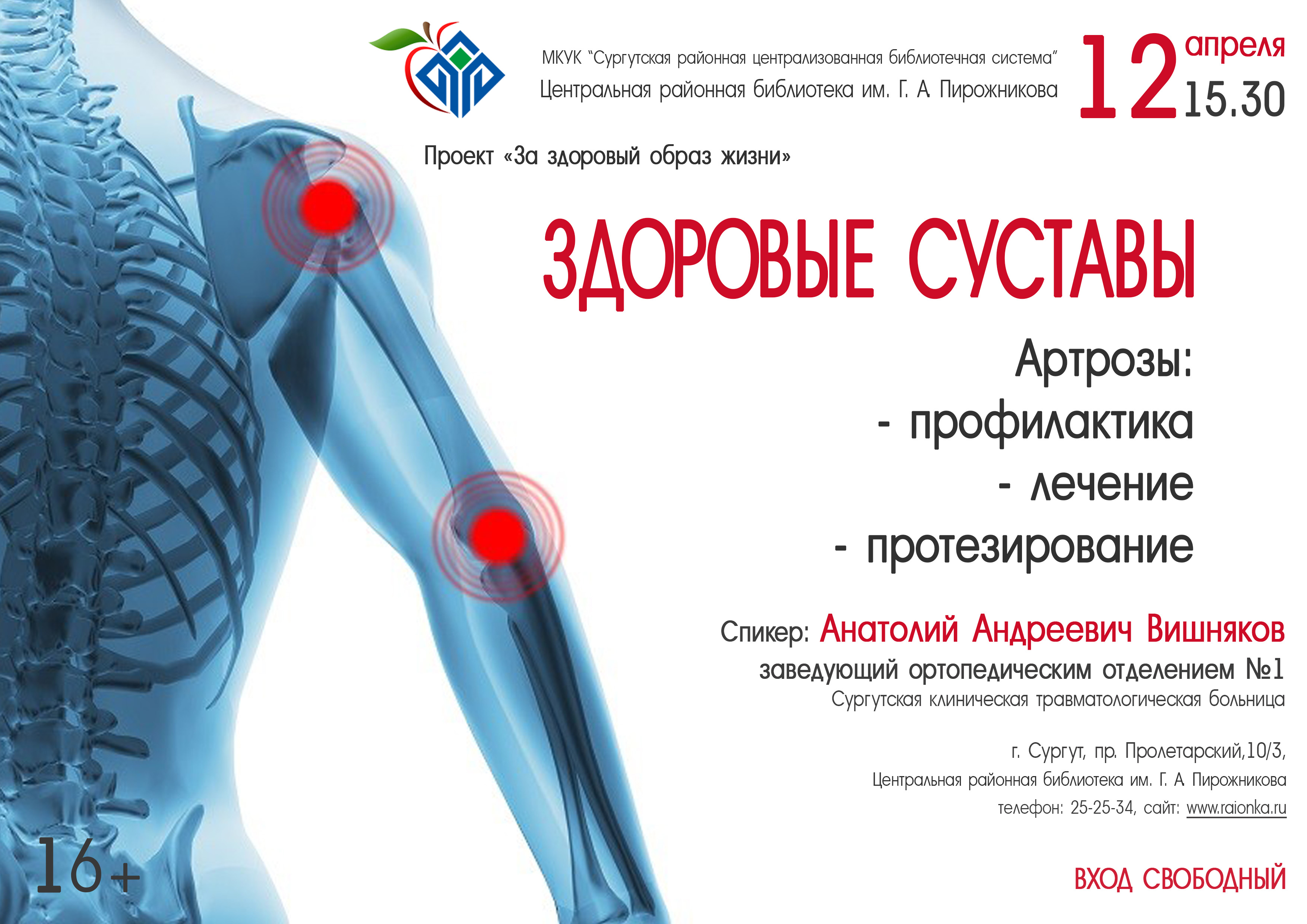 Уже 12 апреля для читателей библиотеки выступит заведующий ортопедическим отделением № 1 Анатолий Вишняков. Хирург расскажет о заболеваниях суставов и методах их лечения.