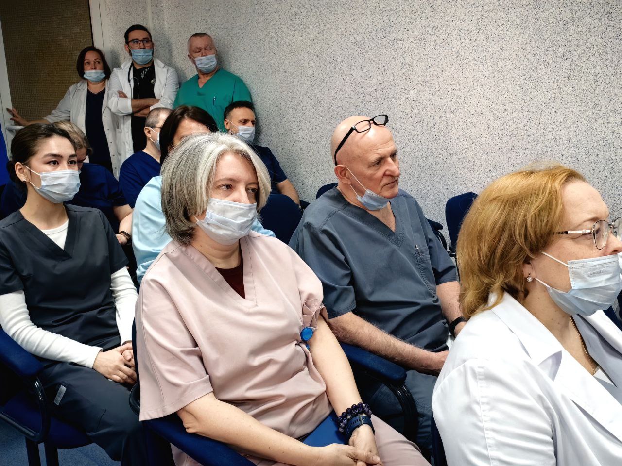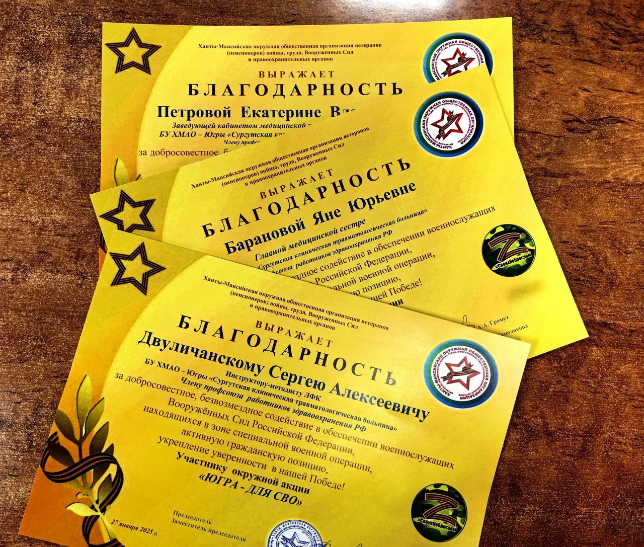 И сегодня же трое наших сотрудников удостоены персональной благодарности Ханты-Мансийской окружной общественной организации ветеранов войны, труда, Вооруженных Сил и правоохранительных органов. За организацию регулярных благотворительных сборов гуманитарной помощи бойцам СВО отмечены главная медицинская сестра Яна Баранова, инструктор-методист ЛФК Сергей Двуличанский и врач-методист Екатерина Петрова.