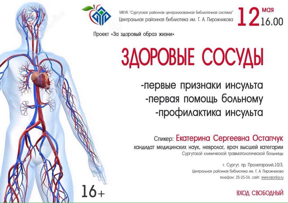 А уже 12 мая состоится лекция «Здоровые сосуды». Врач Инсультного центра Травматологической больницы Екатерина Остапчук расскажет о признаках инсульта, первой помощи при заболевании и т.д.