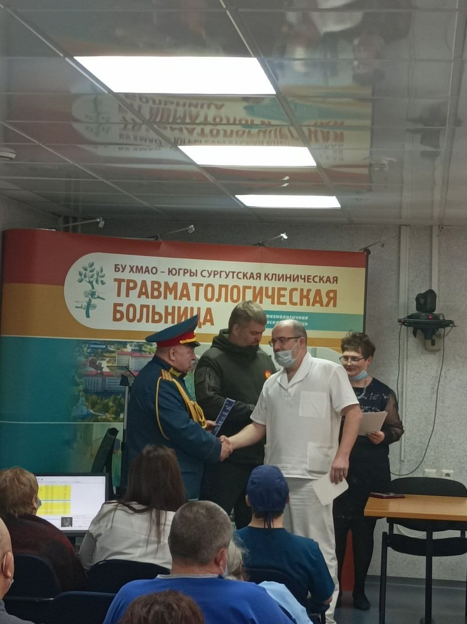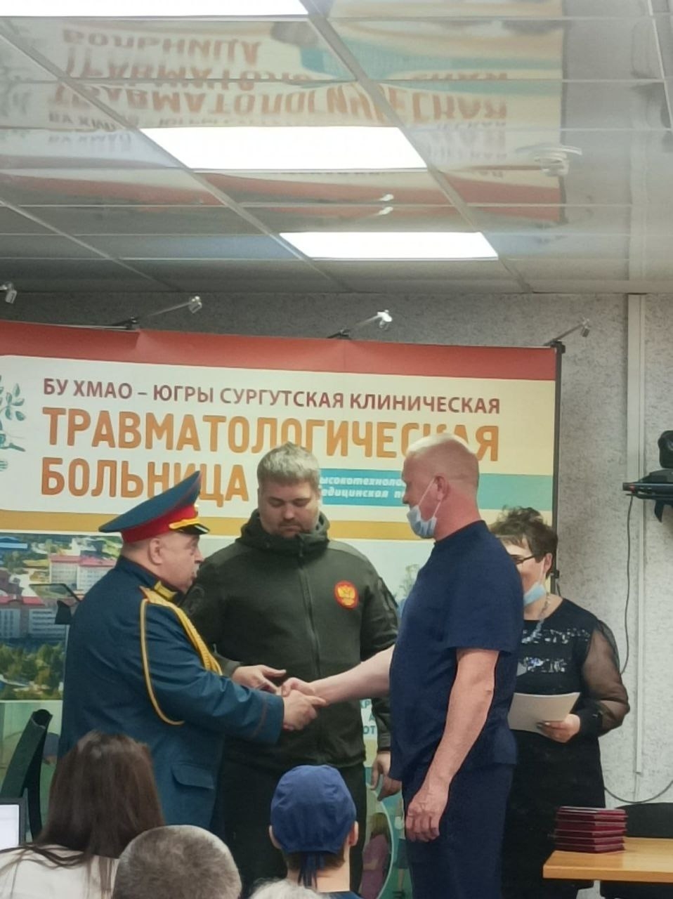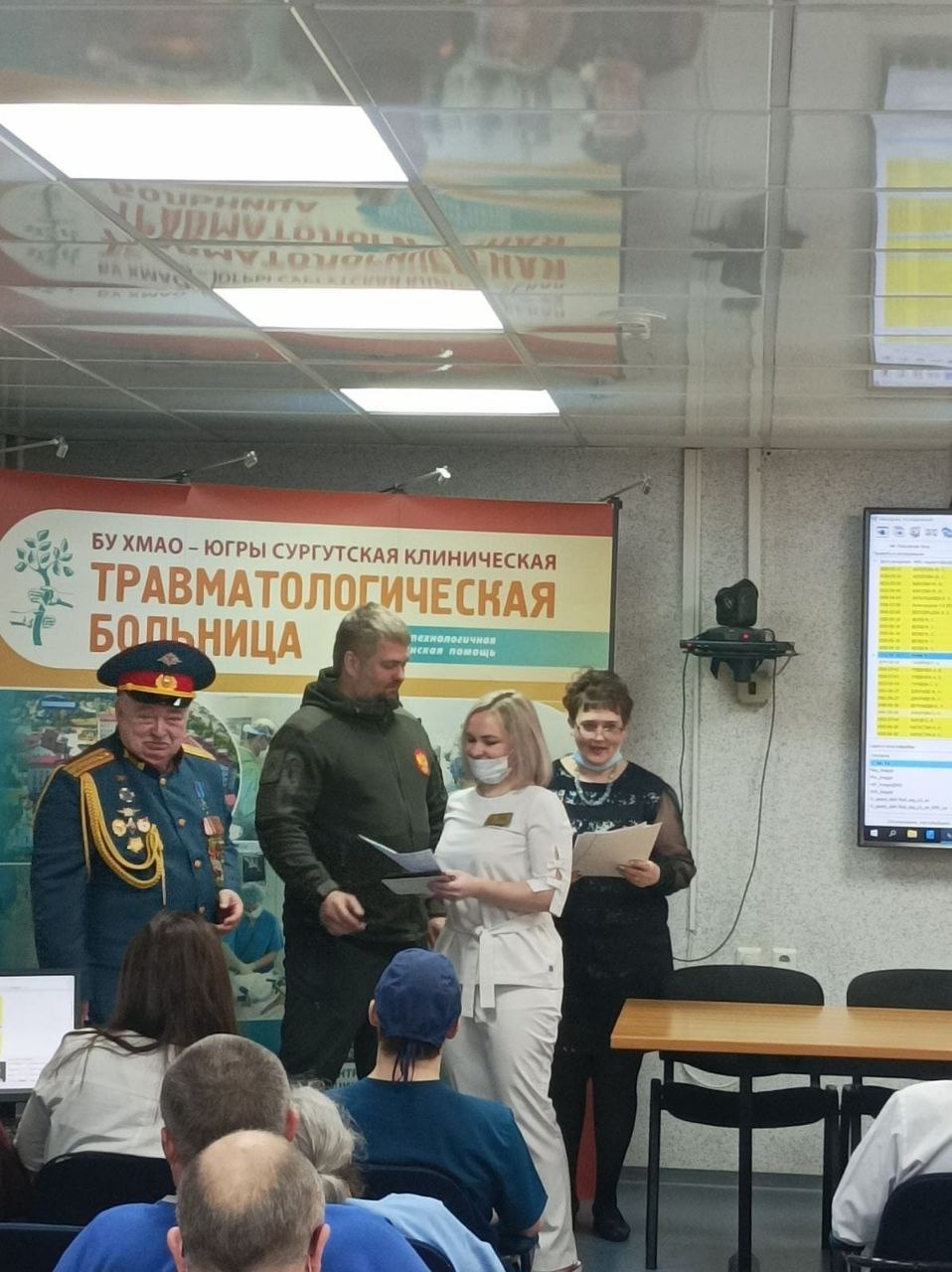 Накануне праздника Великой Победы коллектив Сургутской травмбольницы принимал поздравления и награды от регионального отделения общероссийской общественной организации "Офицеры России". Её благодарностями и медалями отмечены около 20-ти наших сотрудников. Многие из них побывали на прифронтовых территориях. Но в списке также и те, кто на своём рабочем месте самоотверженно, добросовестно и профессионально помогает прибывающим из зоны боевых действий мирным жителям и военнослужащим.